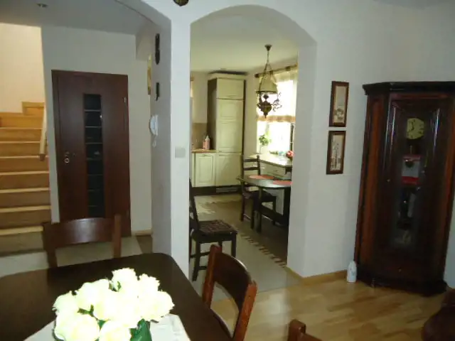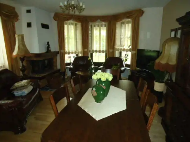Z oddzielonej barkiem jadalni przejście do dużego słonecznego salonu z kominkiem i wyjściem na obszerny taras ok. 20 m2 wyłożonego terakotą.