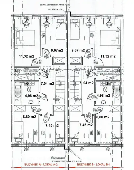 - pokoje: 11,32 m2/ 9,67 m2/ 8,80 m2/ 7,45 m2