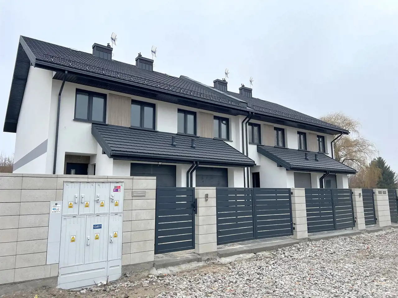 domy wybudowane z bloczków H+H/ docieplenie styropian 20 cm, ściany szczytowe wełna/ tynk zew. sylikatowy; dach - deskowany, pokryty blachodachówką/ okna PCV - trzyszybowe/ tynki wew. - gipsowe bez gładzi/ wylewki betonowe/ drzwi zewnętrzne - metalowe, z przeszkleniem, ocieplone/ brama garażowa segmentowa, z automatem/ ogrzewanie podłogowe - cały lokal: parter i piętro (bez schowka pod schodami)/ na poddasze wyprowadzone media/ podjazdy i miejsca postojowe wyłożone kostką brukową/ instalacje: elektryczna, internetowa, alarmowa, CO, wod-kan., domofonowa/ na dachu zamontowana antena TV/ w kuchni: gaz i siła/ działki ogrodzone, uporządkowane/piec gazowy we własnym zakresie.