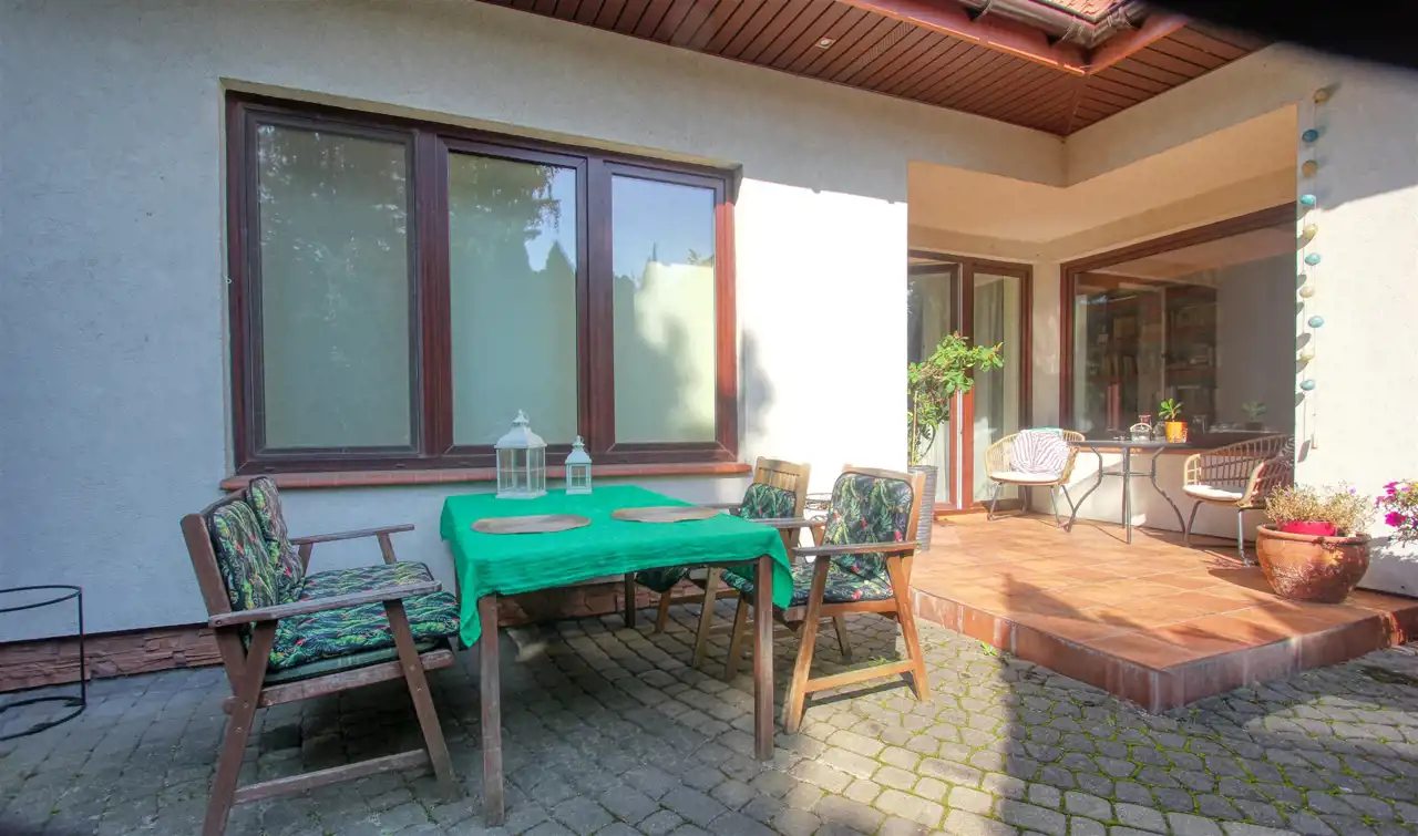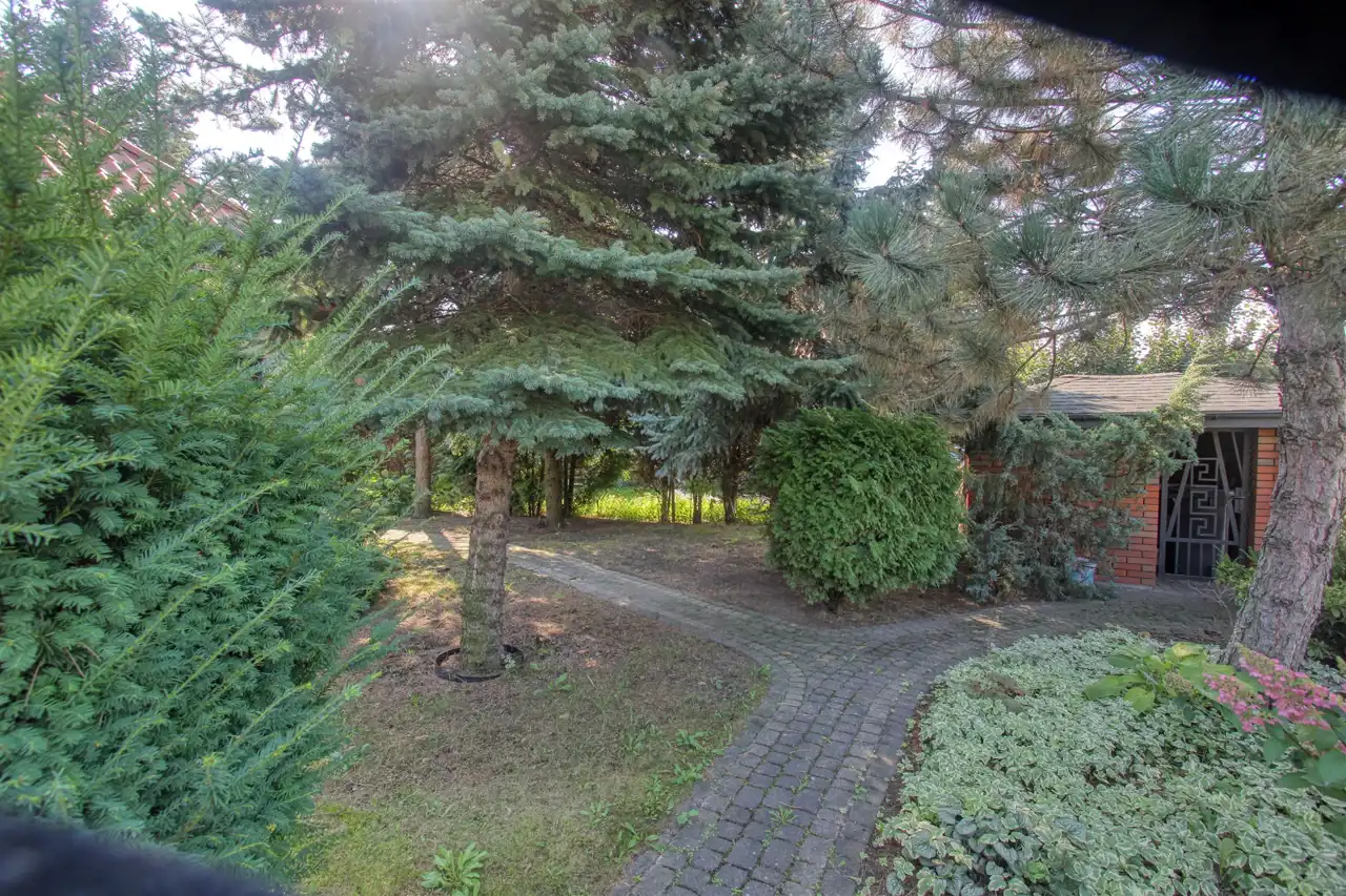 Dom otacza zadbany ogród z trzech stron, co zapewnia poczucie prywatności i spokoju. Powierzchnia działki wynosi 1000 m², co pozwala na wydzielenie różnych stref – miejsca do relaksu, zabawy dla dzieci czy przydomowego ogrodu.