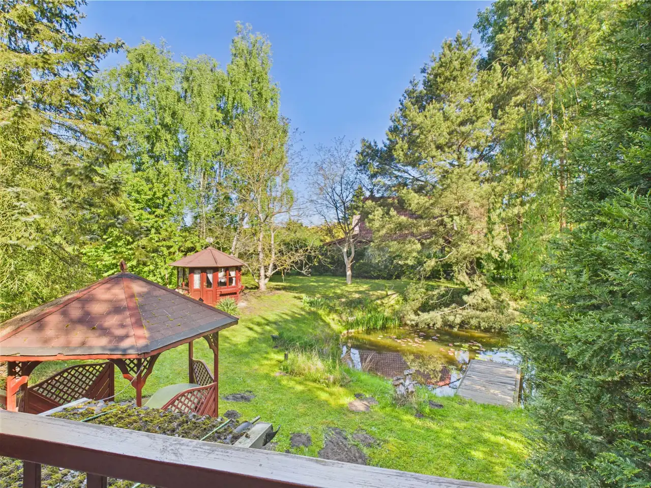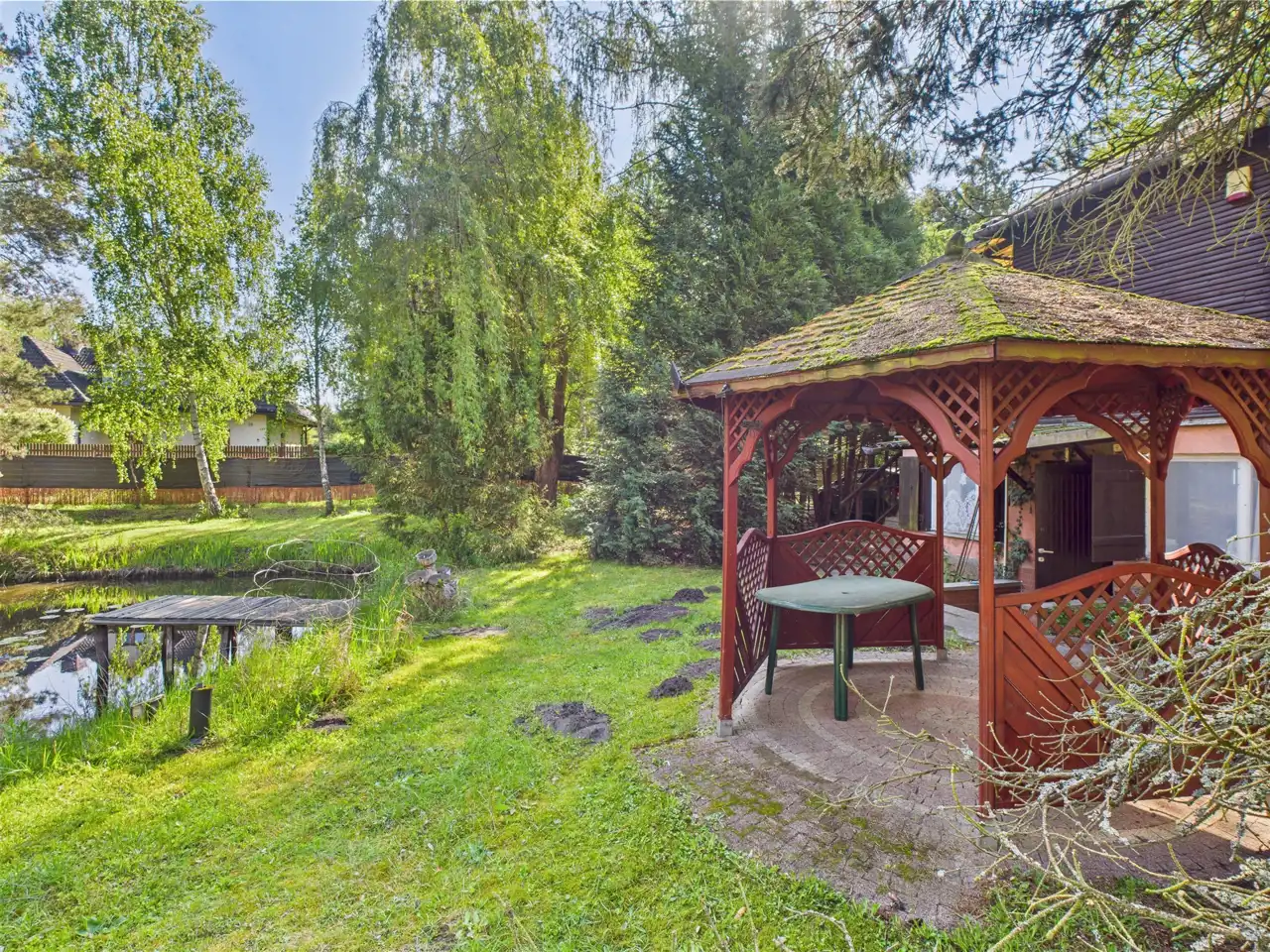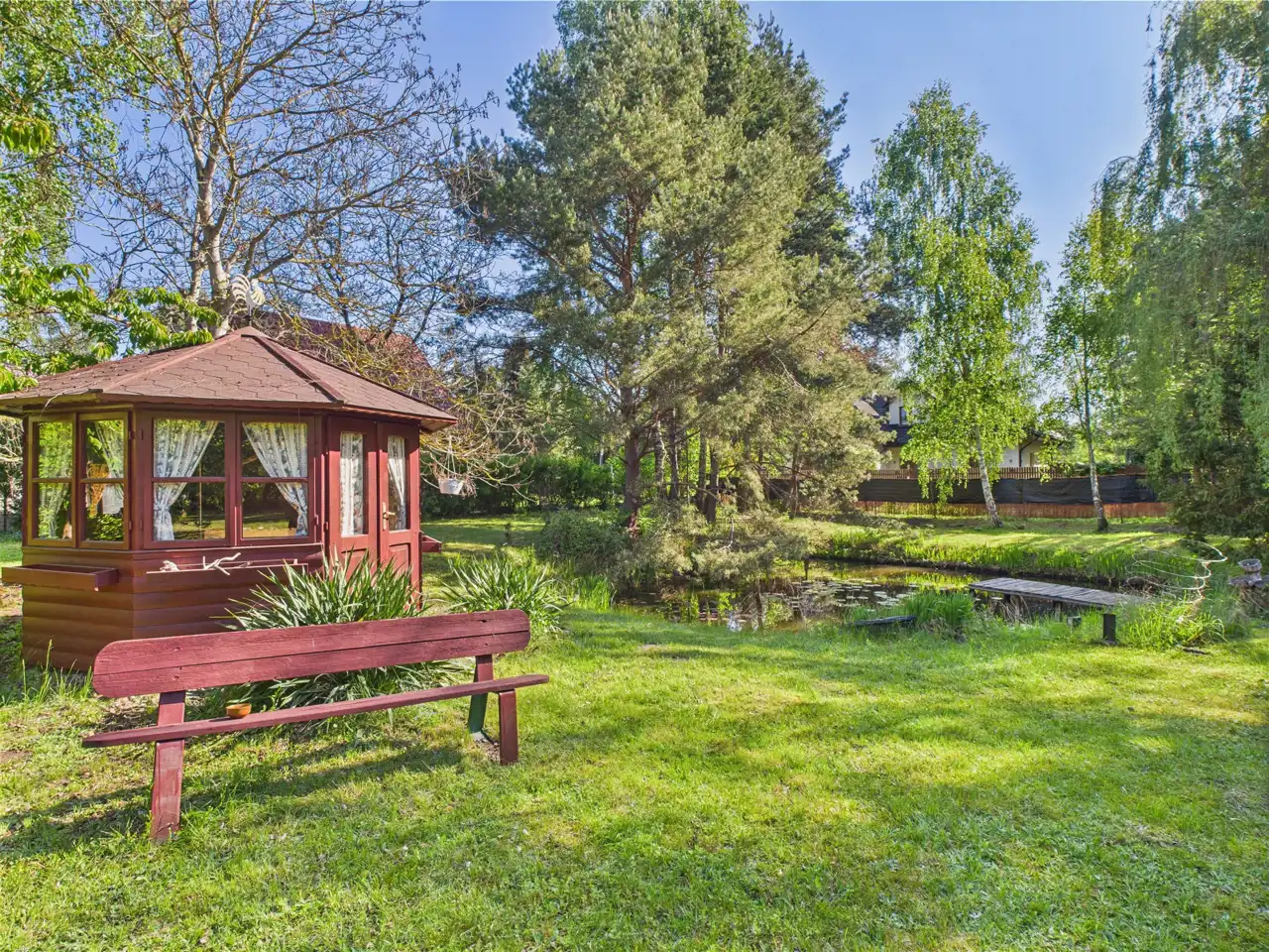 Przepieknie zagospodarowana działka, z mnóstwem drzew, stawem, altankami, domkiem - tworzy bardzo atrakcyjna atmosferę na miejscu.