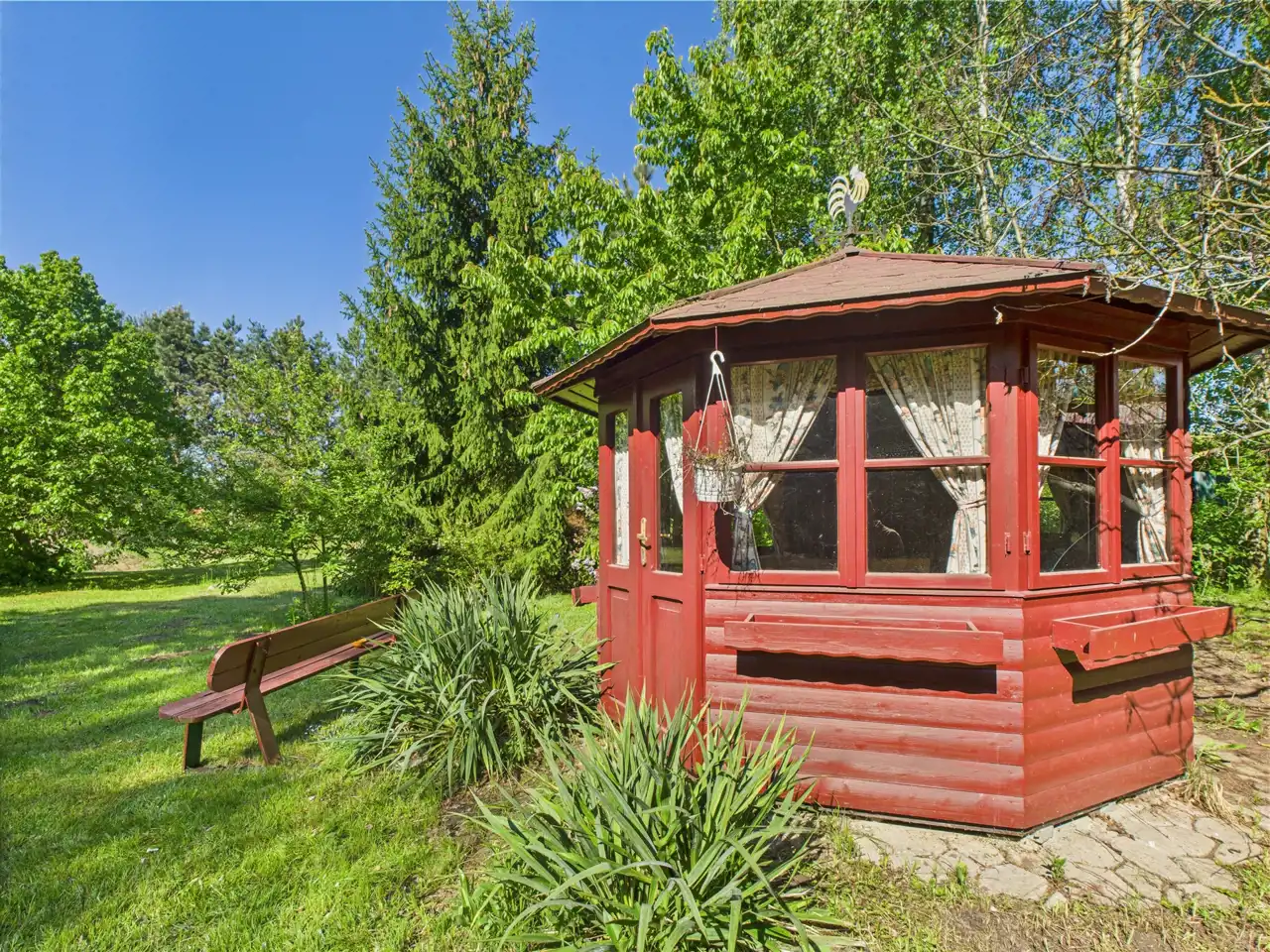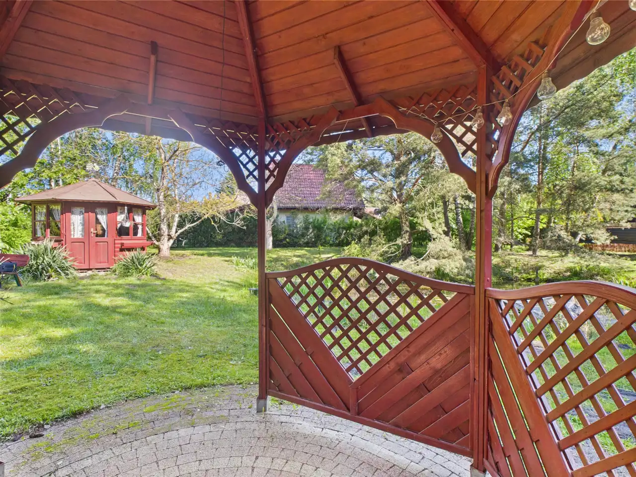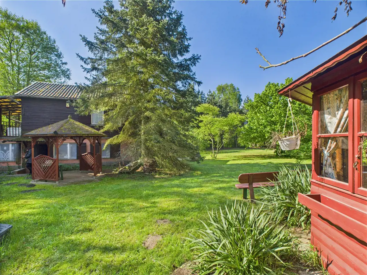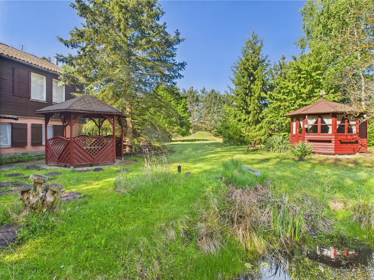 Przepieknie zagospodarowana działka, z mnóstwem drzew, stawem, altankami, domkiem - tworzy bardzo atrakcyjna atmosferę na miejscu.