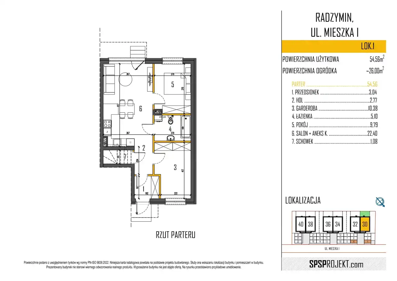 Lokal na parterze składa się z dwóch sypialni (10,38 m2 i 9,79 m2 ) salonu z aneksem kuchennym (22,40 m2) holu (2,77 m2) łazienki (5,10 m2)