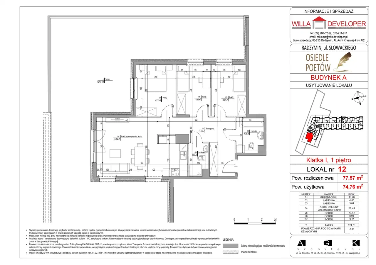Lokal nr 12 znajduje się w budynku mieszkalnym wielorodzinnym z usługami w parterze, zlokalizowany od strony świata północno-zachodniej, położony na I piętrze. Do lokalu należy zakupić miejsce parkingowe w garażu podziemnym dostępne na poziomie -1.