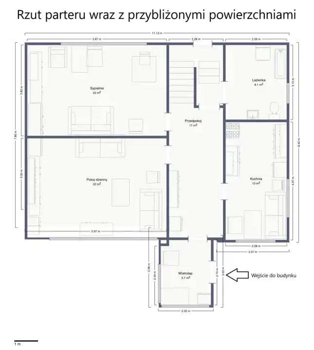Spis pomieszczeń budynku wraz z przybliżonymi powierzchniami:
