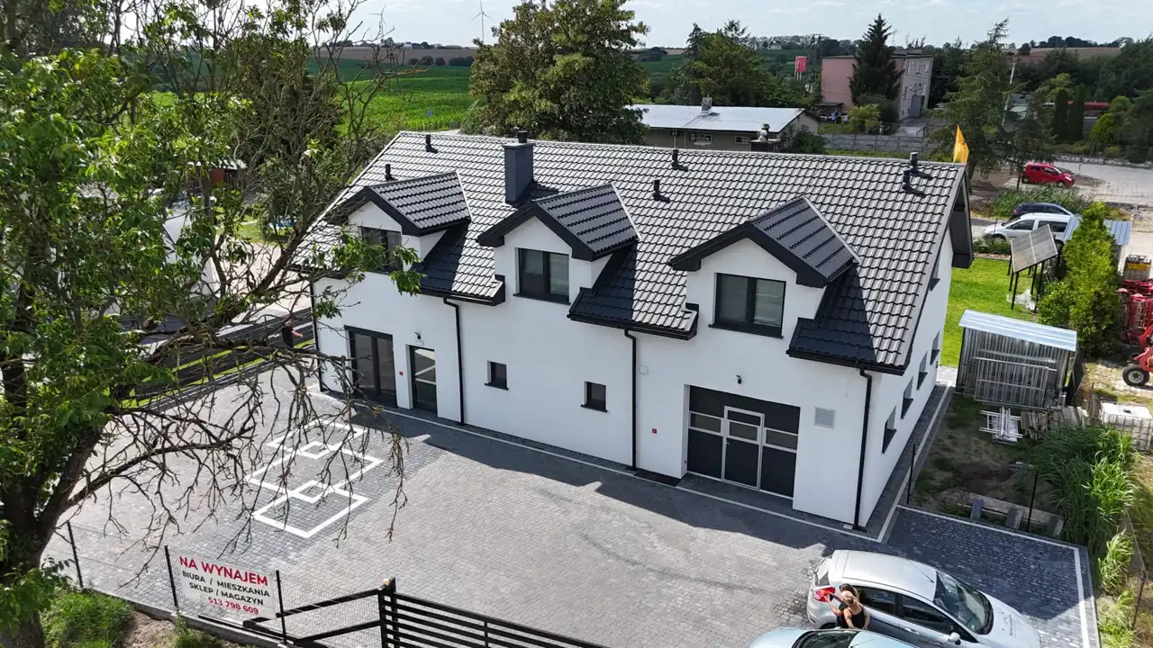 - Przed posesją wykostkowane miejsca parkingowe na 4-5 samochodów, co zapewnia wygodę dla klientów i pracowników.