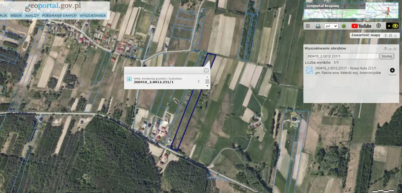 For sale: Unbuilt land property with an area of 16,600 sqm (1.66ha), located in Nowa Huta, Raków municipality, kielecki county. The property is situated in the first line in relation to provincial road No. 764, with direct access to it (need to request permission for access). Access is also possible from the other side via an unpaved municipal road.