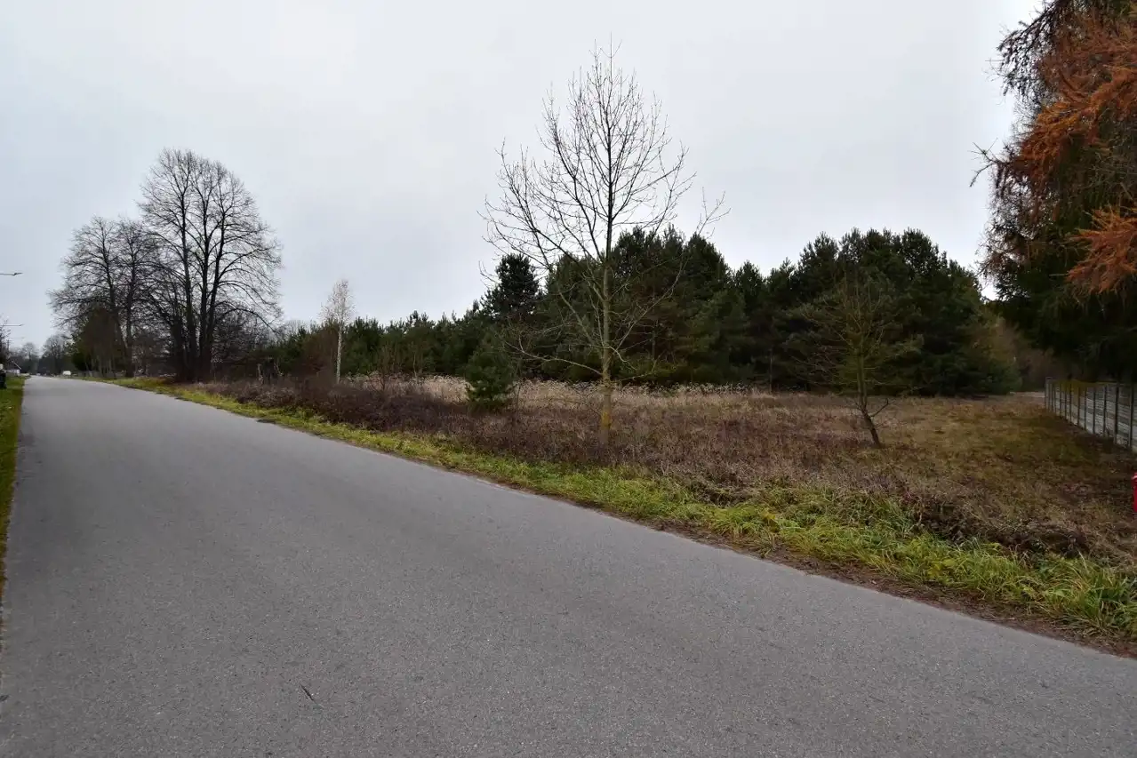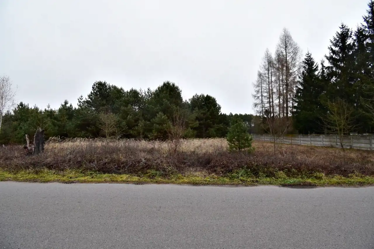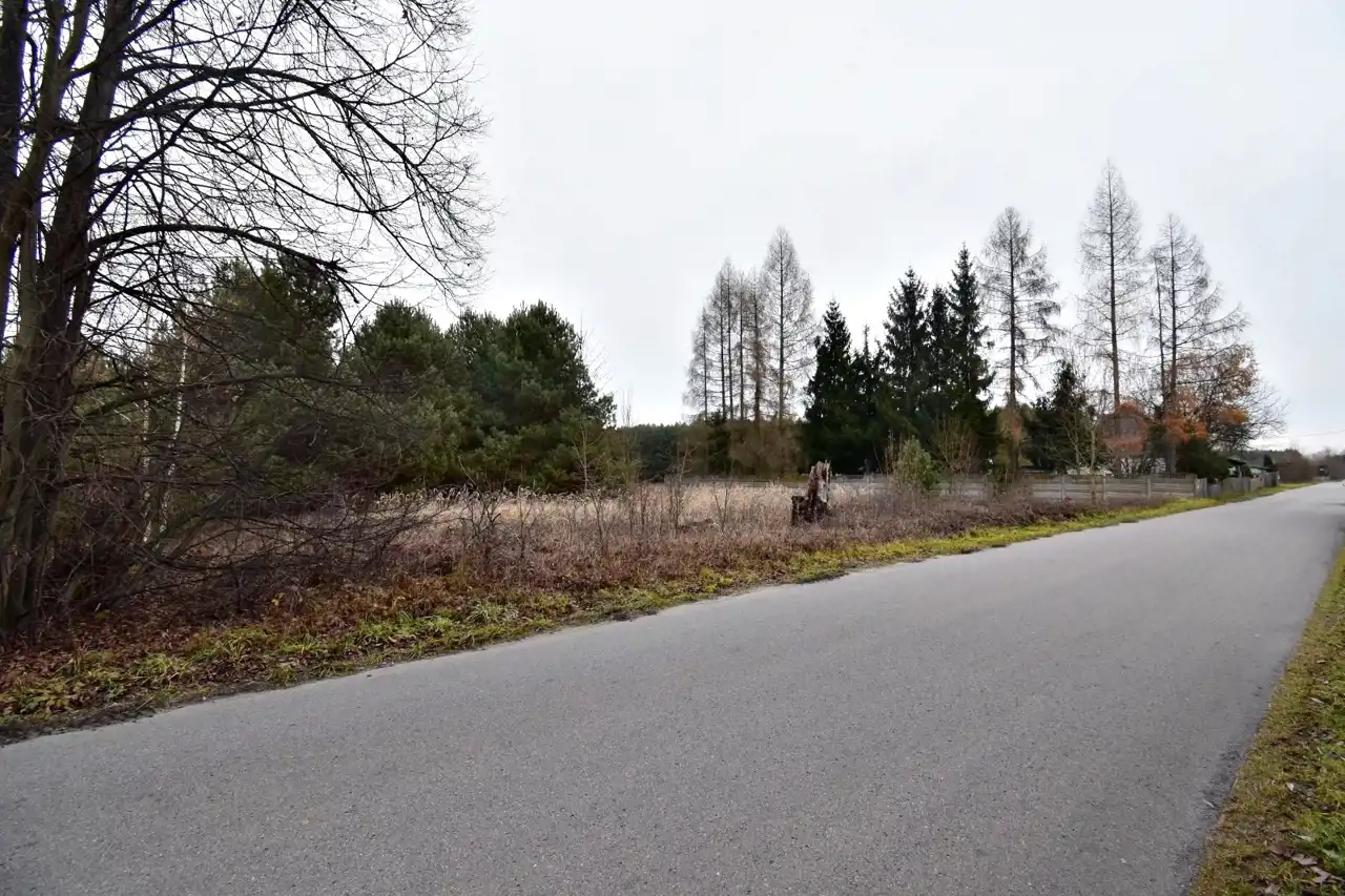 Działka w pierwszej linii względem drogi asfaltowej, niezagospodarowana, na działce zadrzewienia.