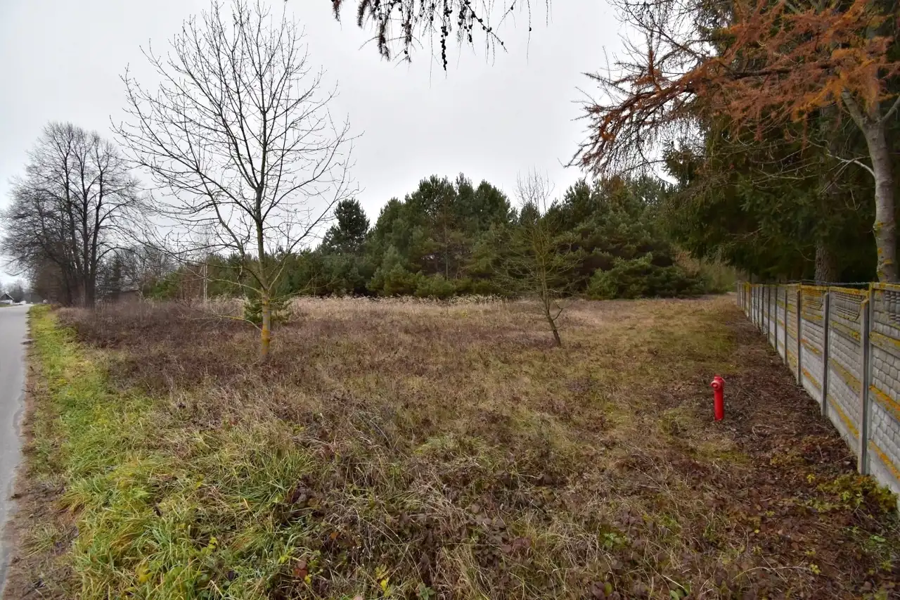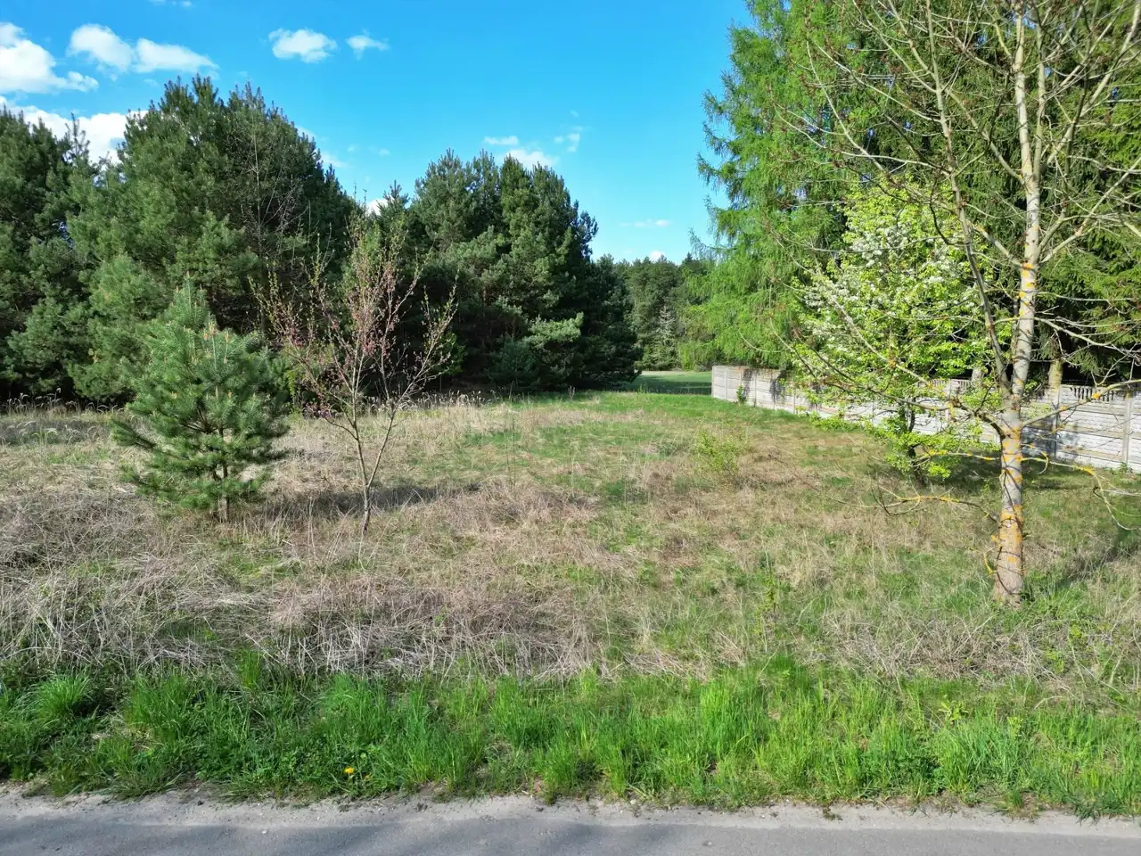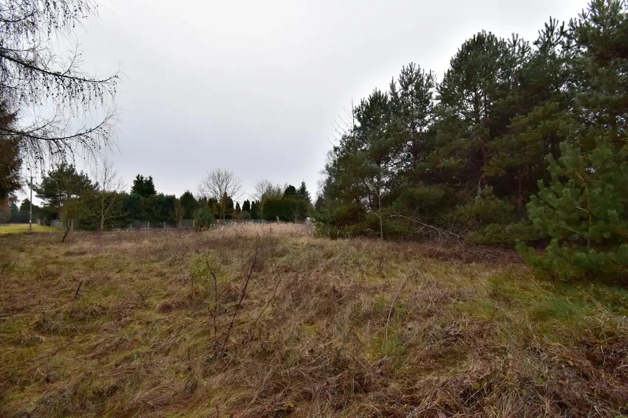 Działka w pierwszej linii względem drogi asfaltowej, niezagospodarowana, na działce zadrzewienia.
