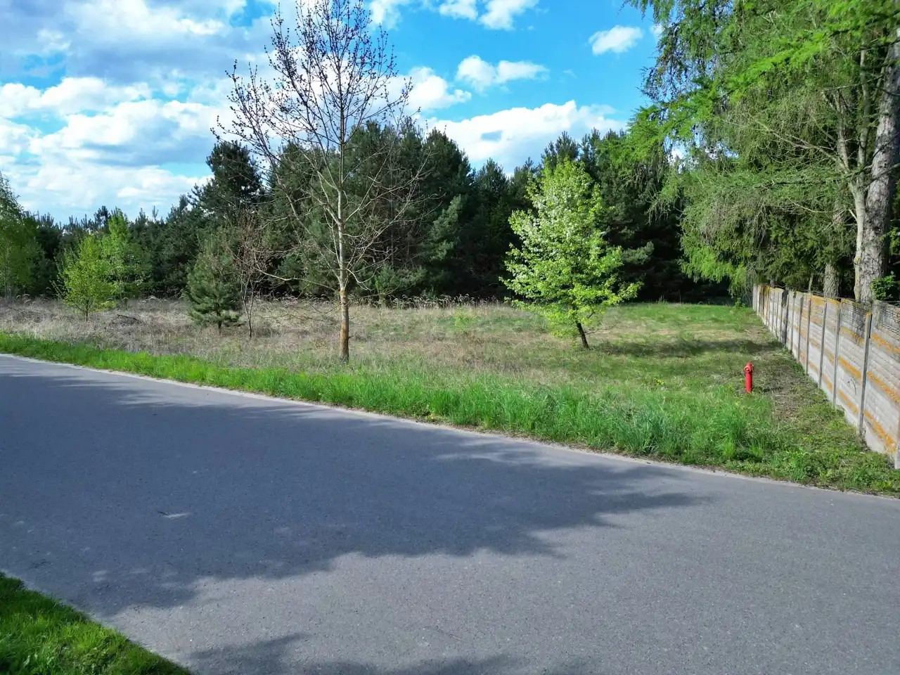 Dojazd do działki drogą asfaltową. Działka częściowo ogrodzona (częściowo ogrodzenie betonowe z prawej strony działki).