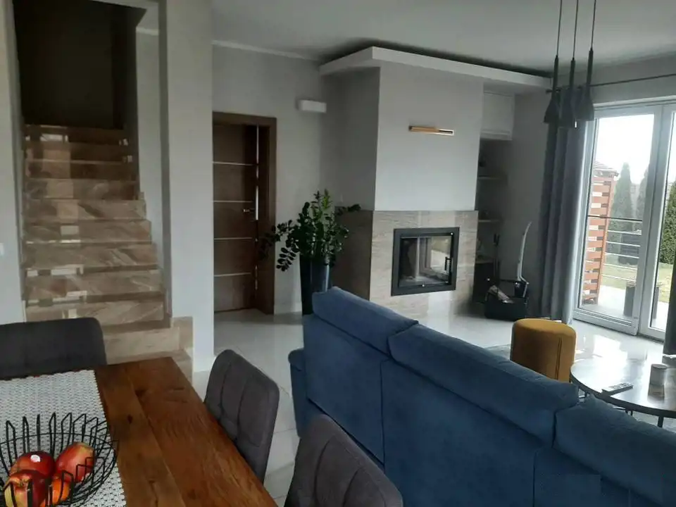 W salonie znajduje się kominek z rozprowadzeniem instalacji na piętra.