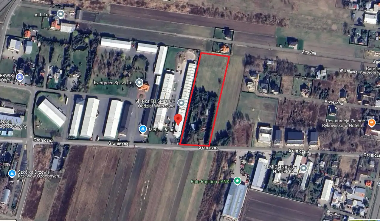 Działka inwestycyjna o powierzchni 1,28 ha, usytuowana w Jankach, bardzo blisko Al. Krakowskiej (ok. 450 m).