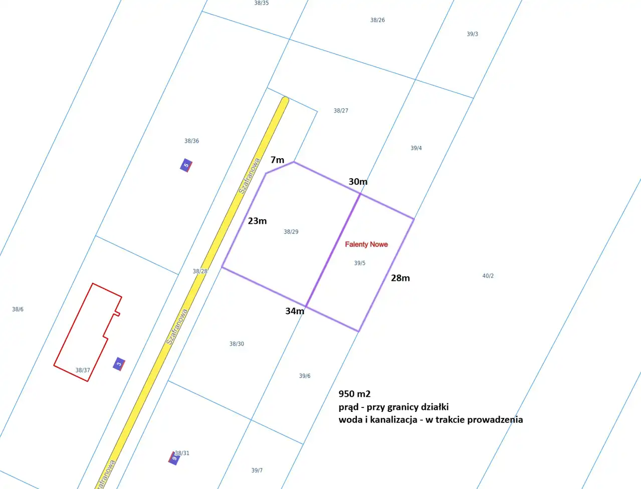 - Media Woda: w trakcie prowadzenia; Kanalizacja: w trakcie prowadzenia; Prąd: w ulicy; Gaz: brak