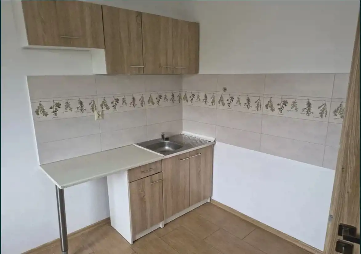 Biuro po remoncie, składa się z pomieszczenia biurowego, kuchni i łazienki.