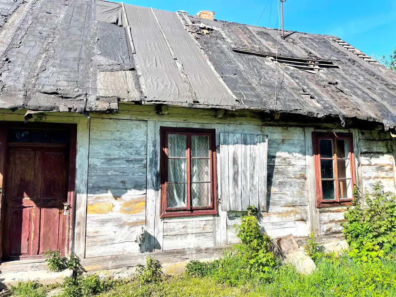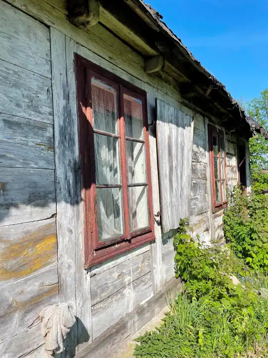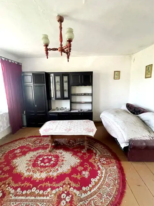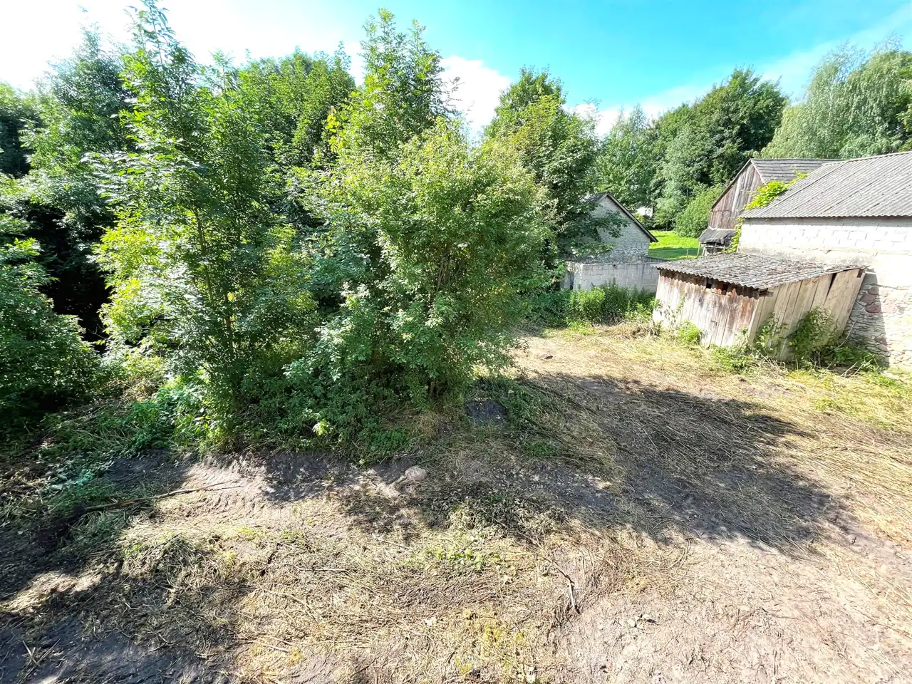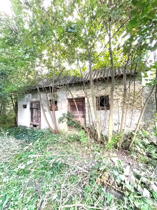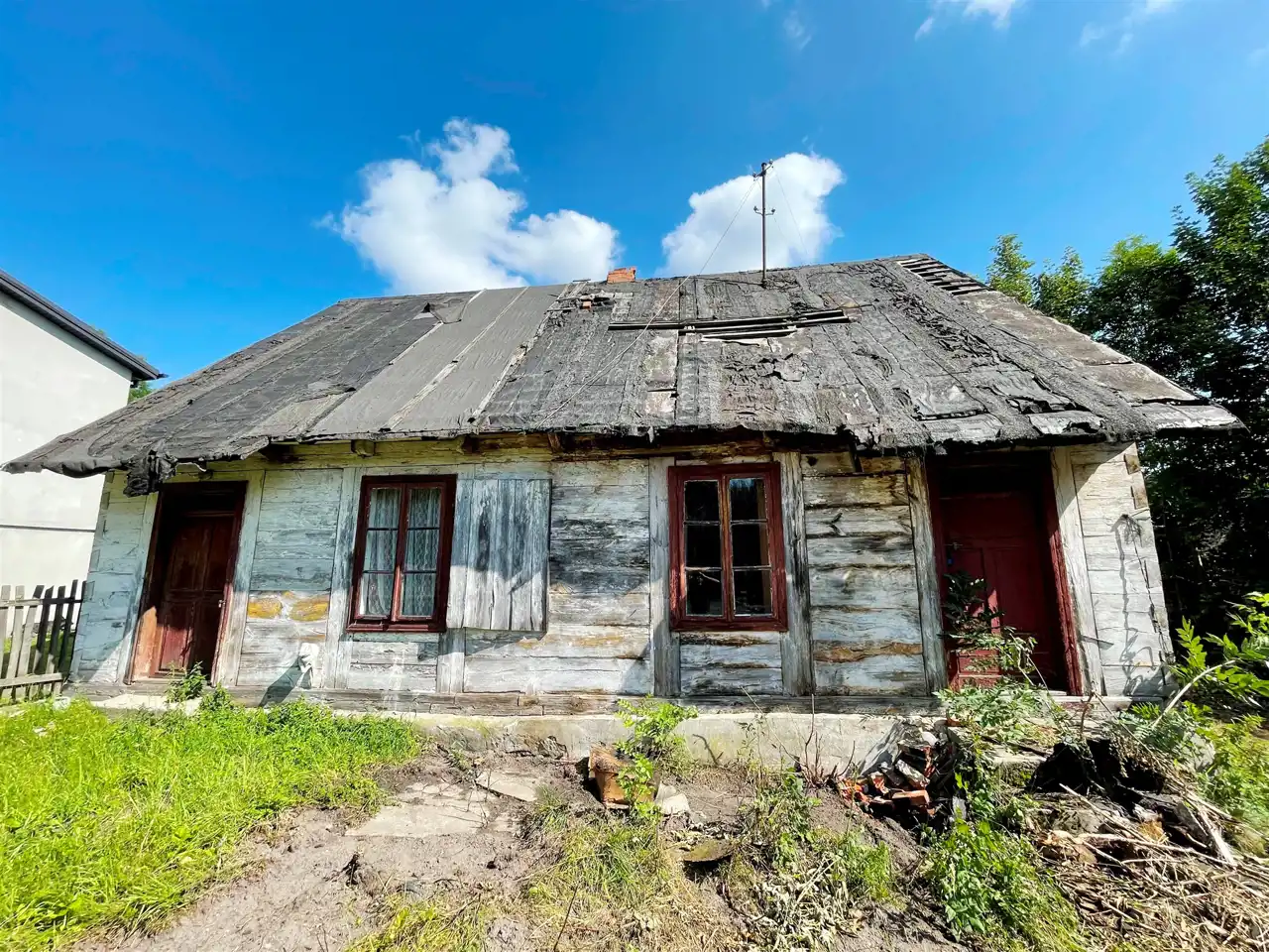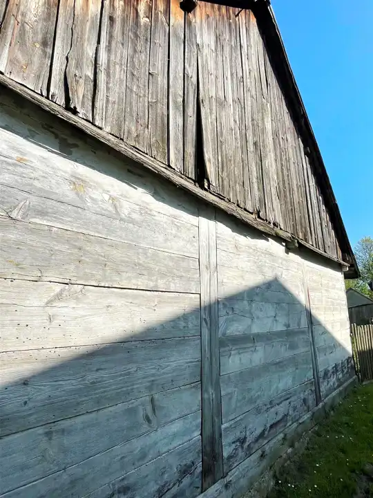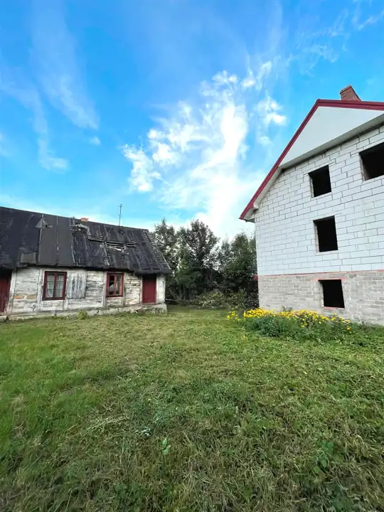 Od frontu na działce znajduje się jeszcze drewniany budynek mieszkalny o pow.zabudowy ok.70 m.kw, kryty papą ( niezamieszkały ok.100 letni). Przy zachodniej granicy działki znajduje się budynek gospodarczy z kamienia wapiennego i cegły kryty eternitem o pow. zabudowy ok.30 m.kw i drewniana komórka kryta eternitem o pow. ok.8 m.kw.