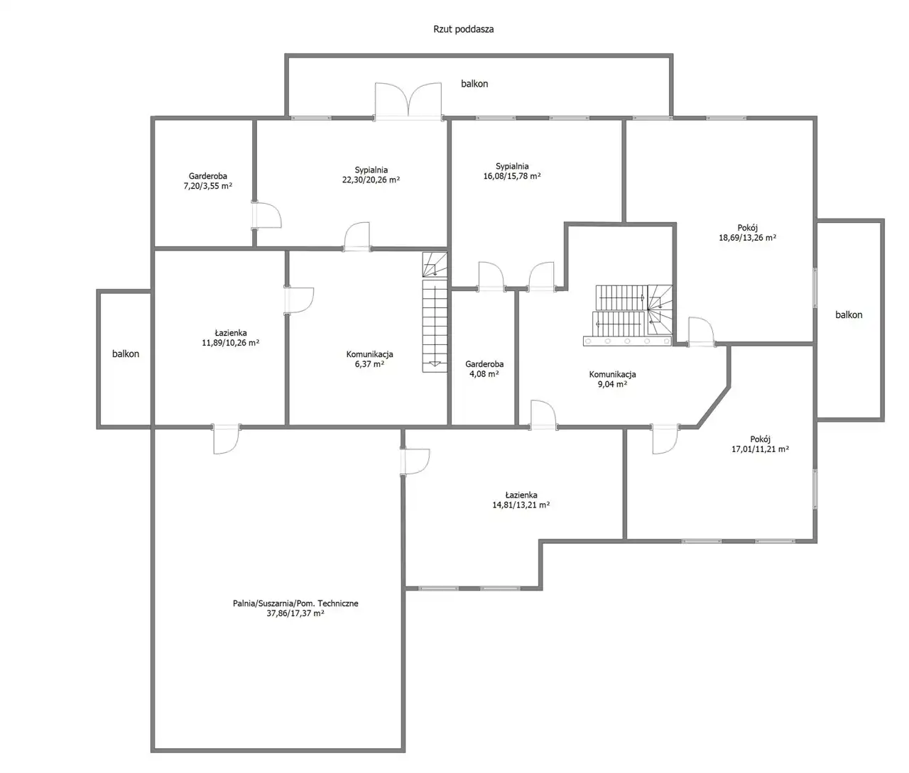 - Trzy pokoje ( 15,78; 13,26; 11,21m2)