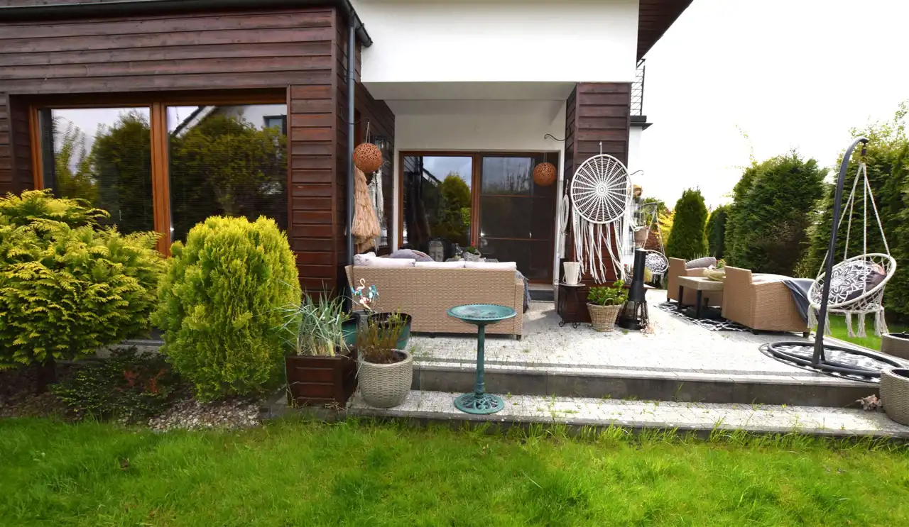 Wjeżdżając na posesję przenosisz się do błogiej krainy spokoju i odpoczynku w komfortowych warunkach wśród wszechotaczającej zieleni zapewniającej kameralność.