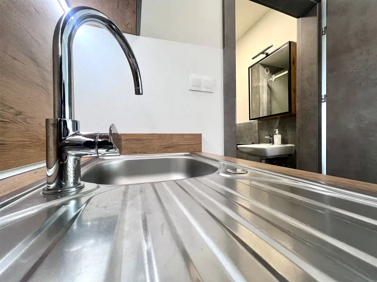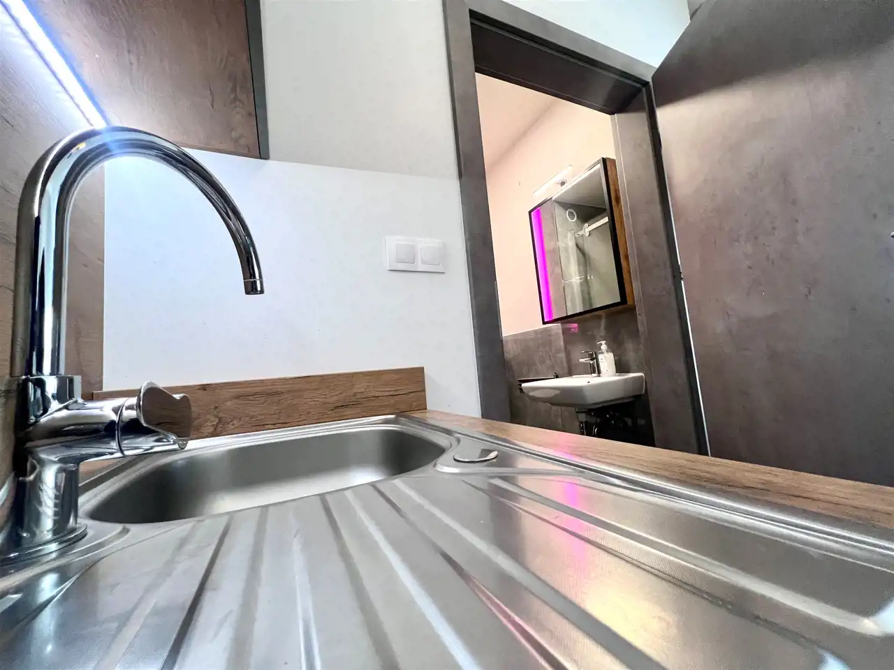 Lokal składa się z dwóch poziomów. Na dole znajduje się przestronny salon z aneksem kuchennym, oraz łazienka.