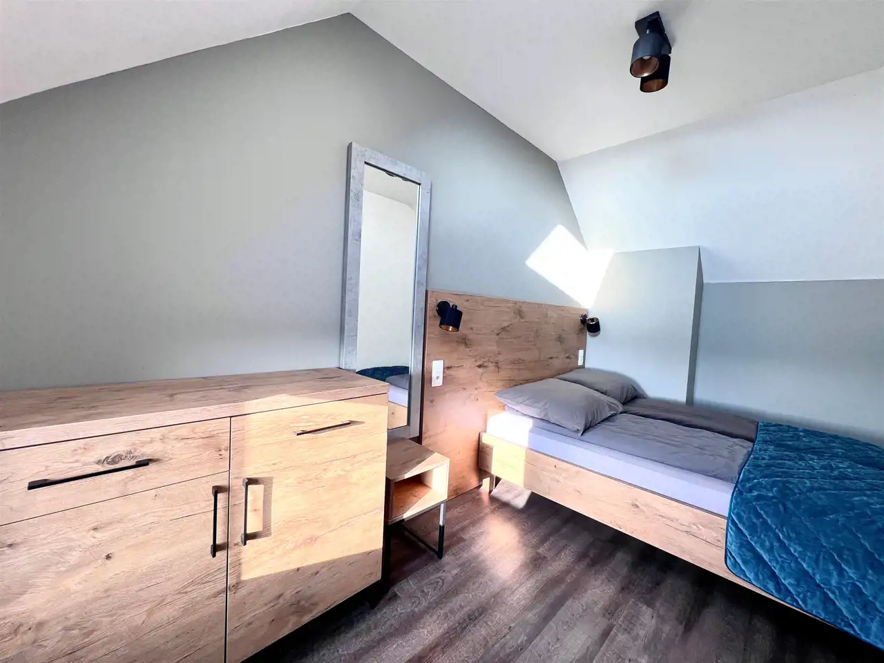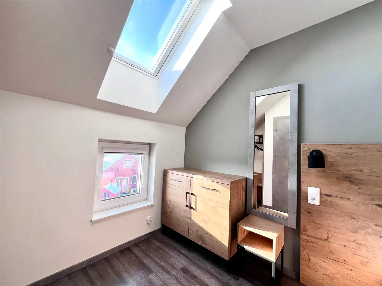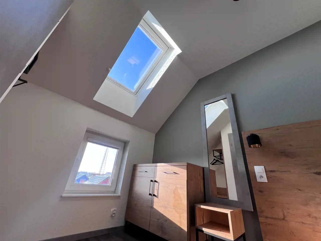 Lokal składa się z dwóch poziomów. Na dole znajduje się przestronny salon z aneksem kuchennym, oraz łazienka. Na górze zaś znajdziemy dwie wygodne sypialnie.