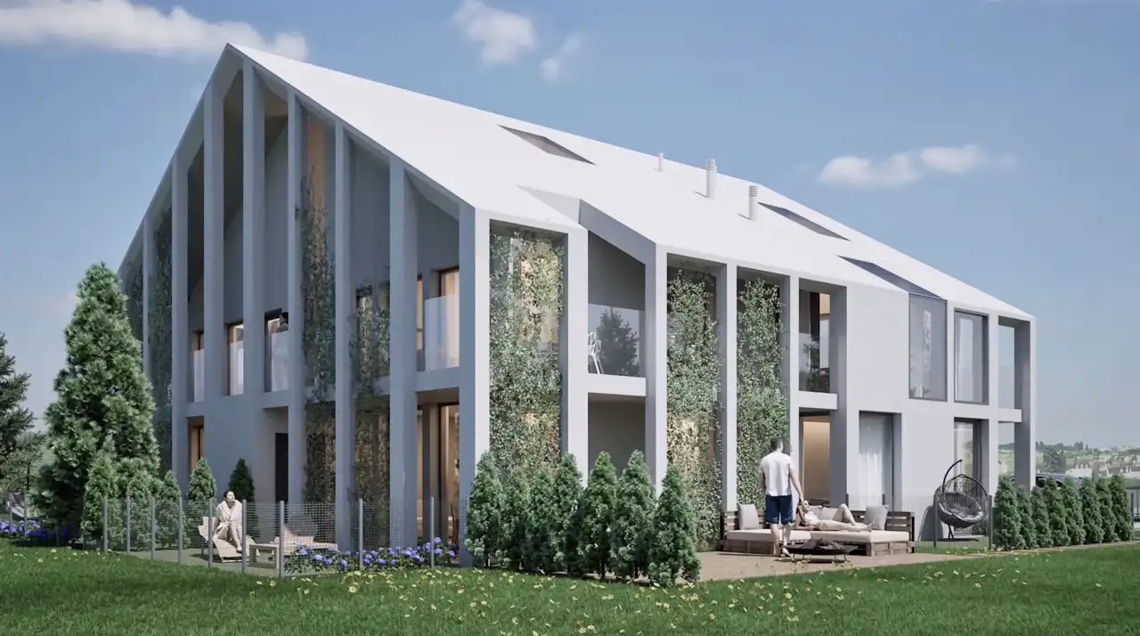 • Każdy apartament składa się z salonu, aneksu kuchennego, osobnej sypialni, łazienki, przedsionku, ogrodu i tarasu.