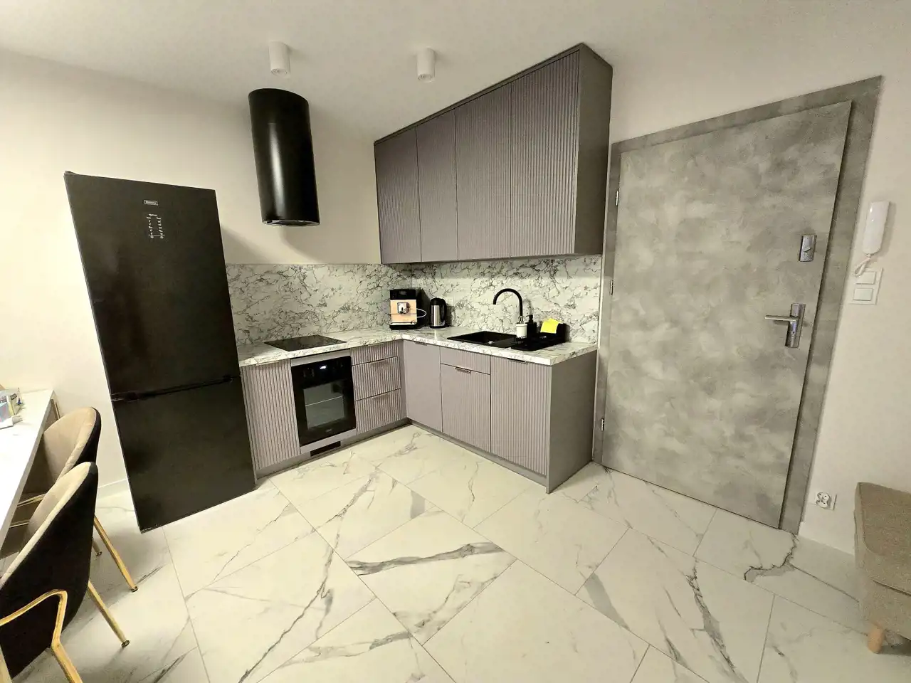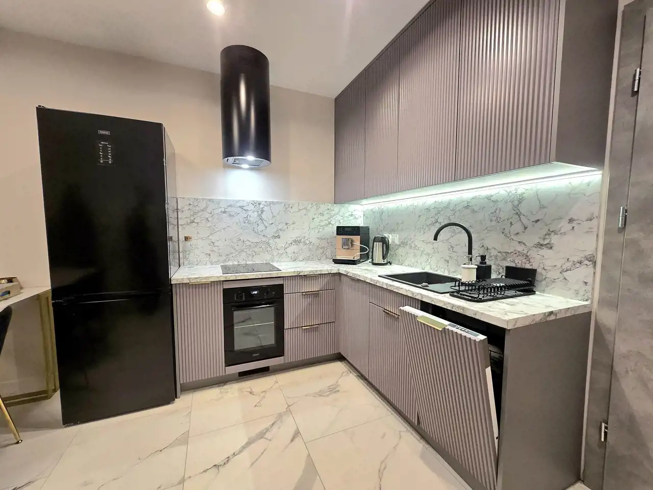 Kuchnia wykonana na wymiar, w pełni wyposażona w sprzęt AGD. Apartament jest gotowy do zamieszkania lub natychmiastowego wynajmu, bez żadnych dodatkowych nakładów.