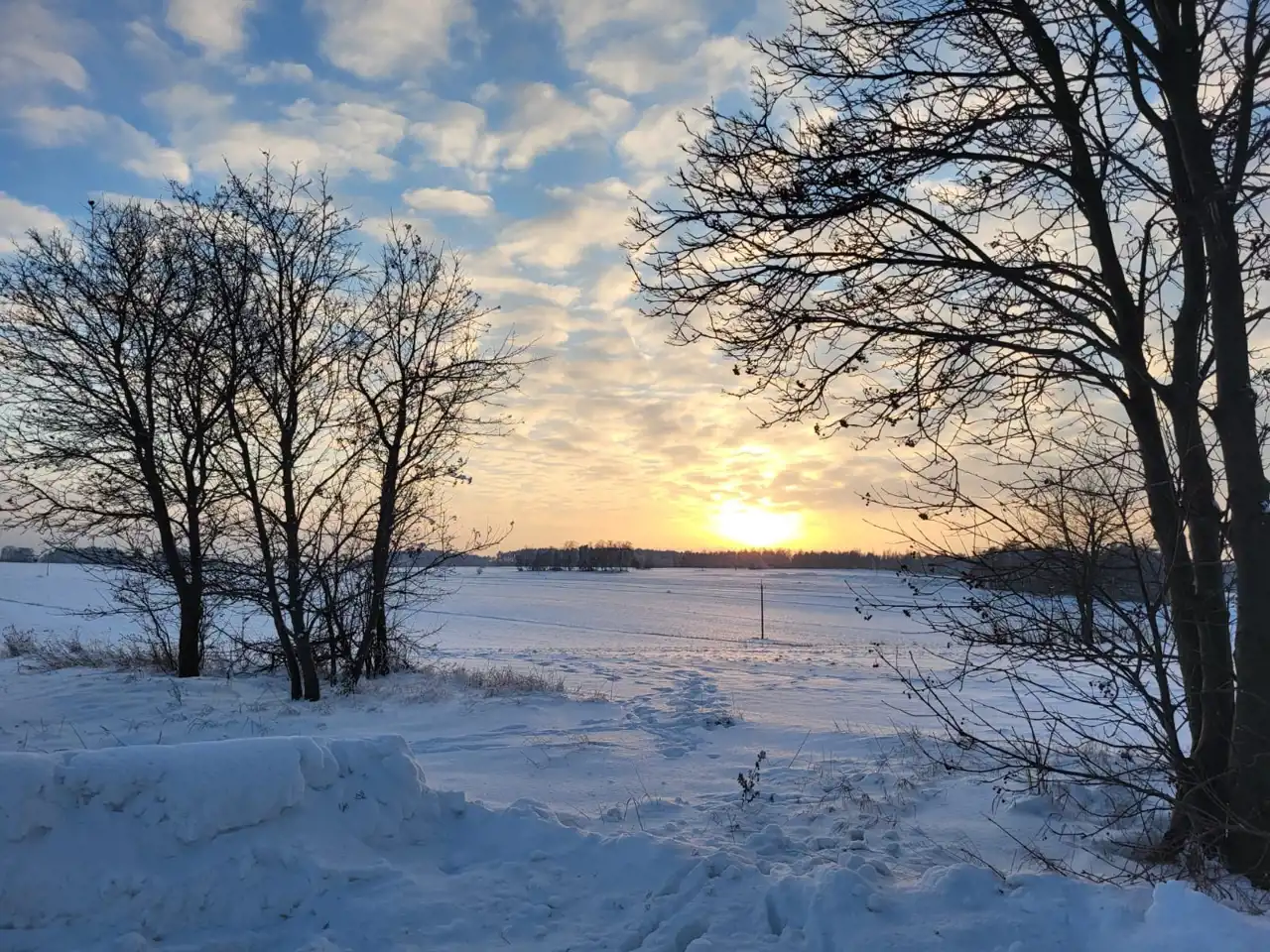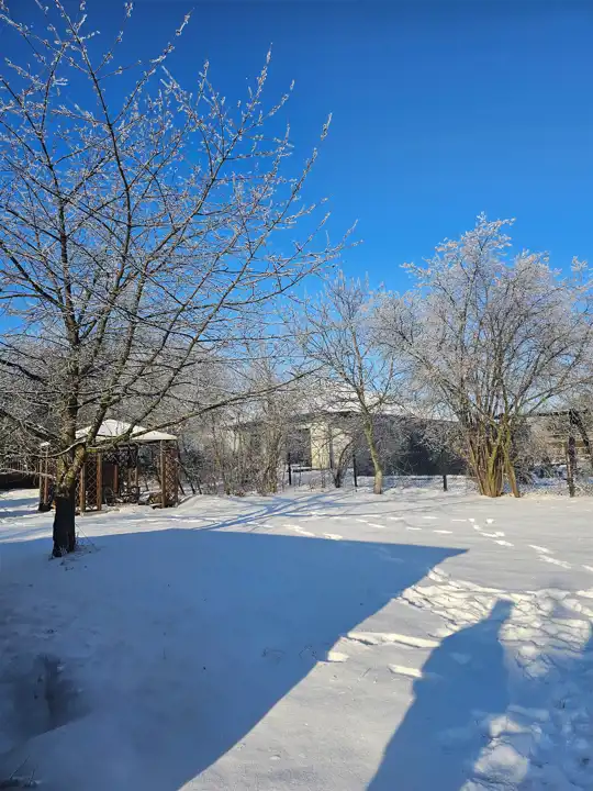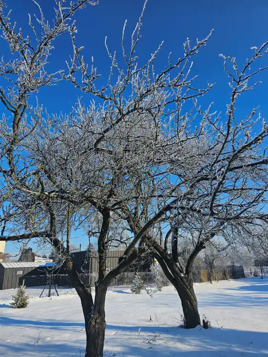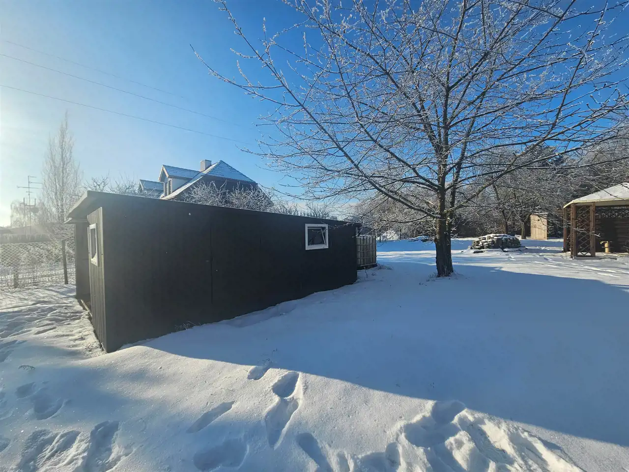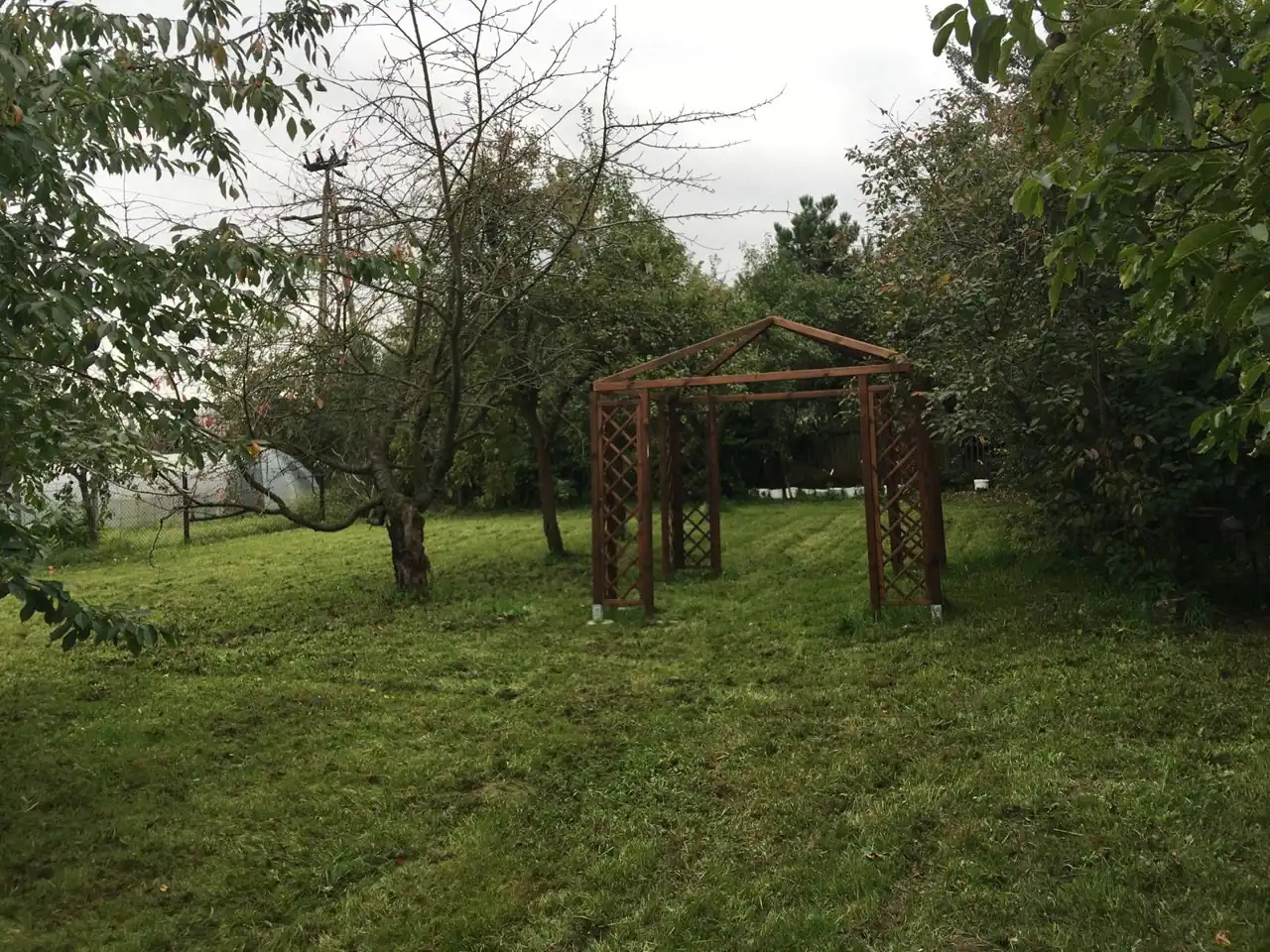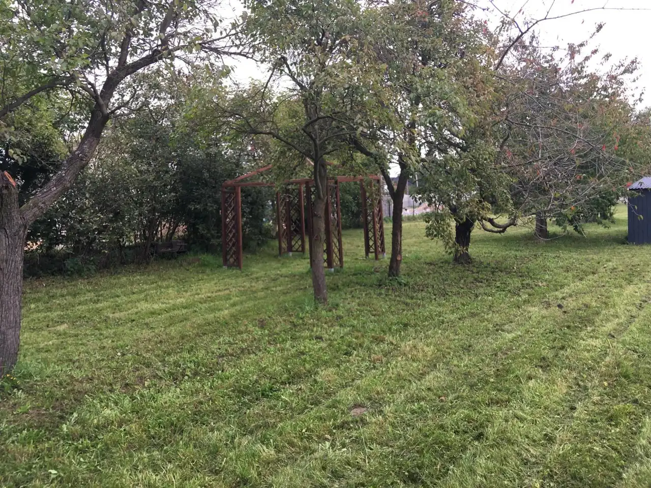Na działce jest kilka drzew owocowych i drewniana altana. Działka jest płaska.