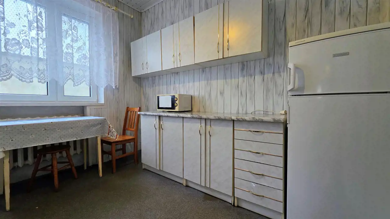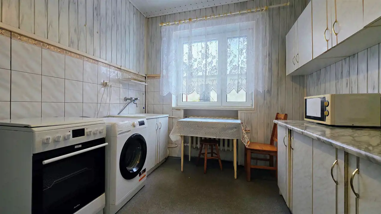 Na ścianach w salonie, sypialni, pokoju zostały położone gładzie, które pomalowano jasnymi farbami oraz położone są tapety. Podłogi zostały wykończone parkietem i panelami podłogowymi. Kuchnia wyposażona została w meble kuchenne - zabudowa w kolorze białym oraz niezbędny sprzęt AGD: lodówko zamrażarkę Electrolux, kuchenkę gazową z piekarnikiem Amica oraz pralkę Indesit. Łazienka na ścianach została wykończona płytkami, a podłoga gresem i wyposażona jest w kabinę prysznicową, wc, zlew i lustro.