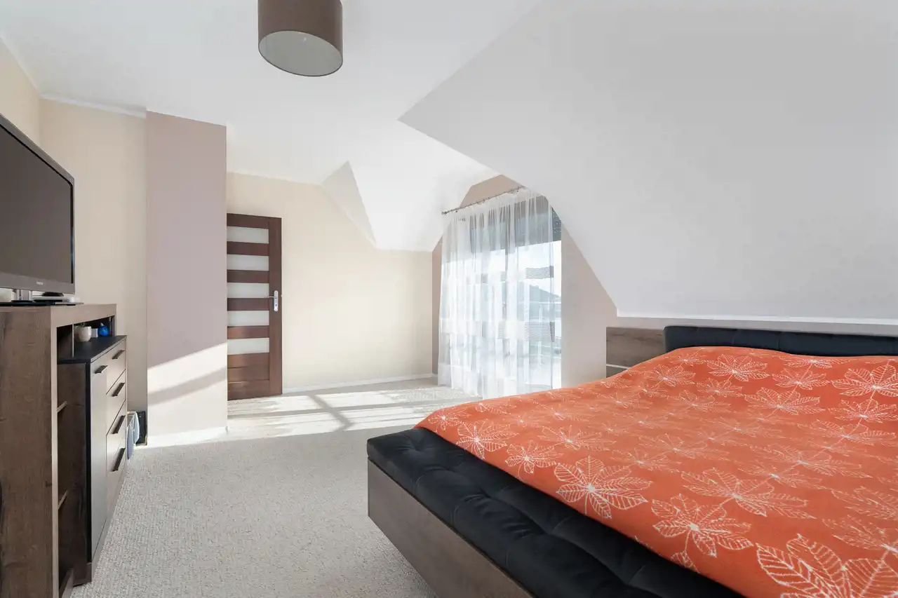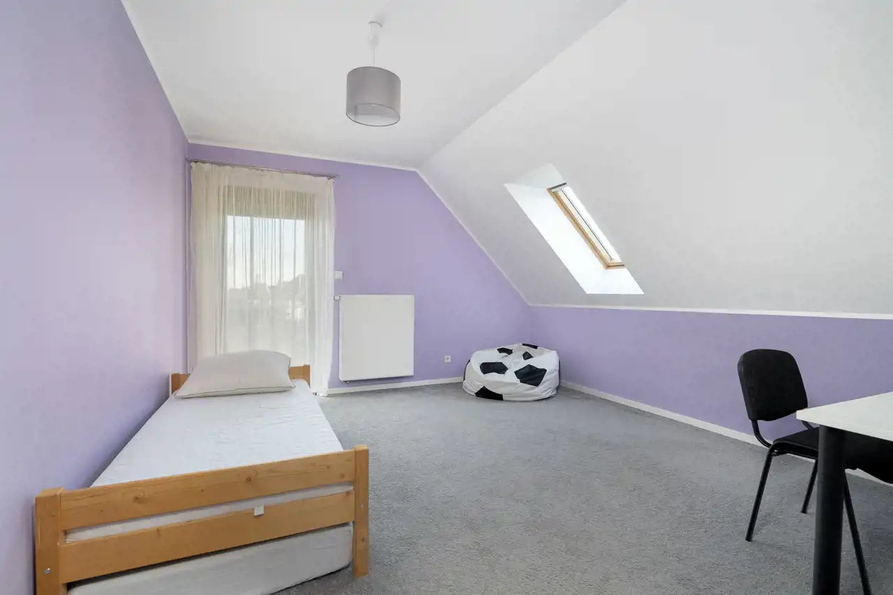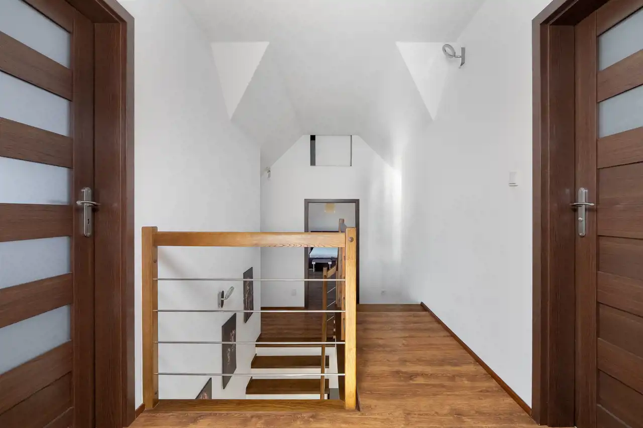 Na półpiętrze sporej wielkości sypialnia z dużą ilością okien połaciowych. Na piętrze 3 sypialnie, łazienka oraz korytarz.