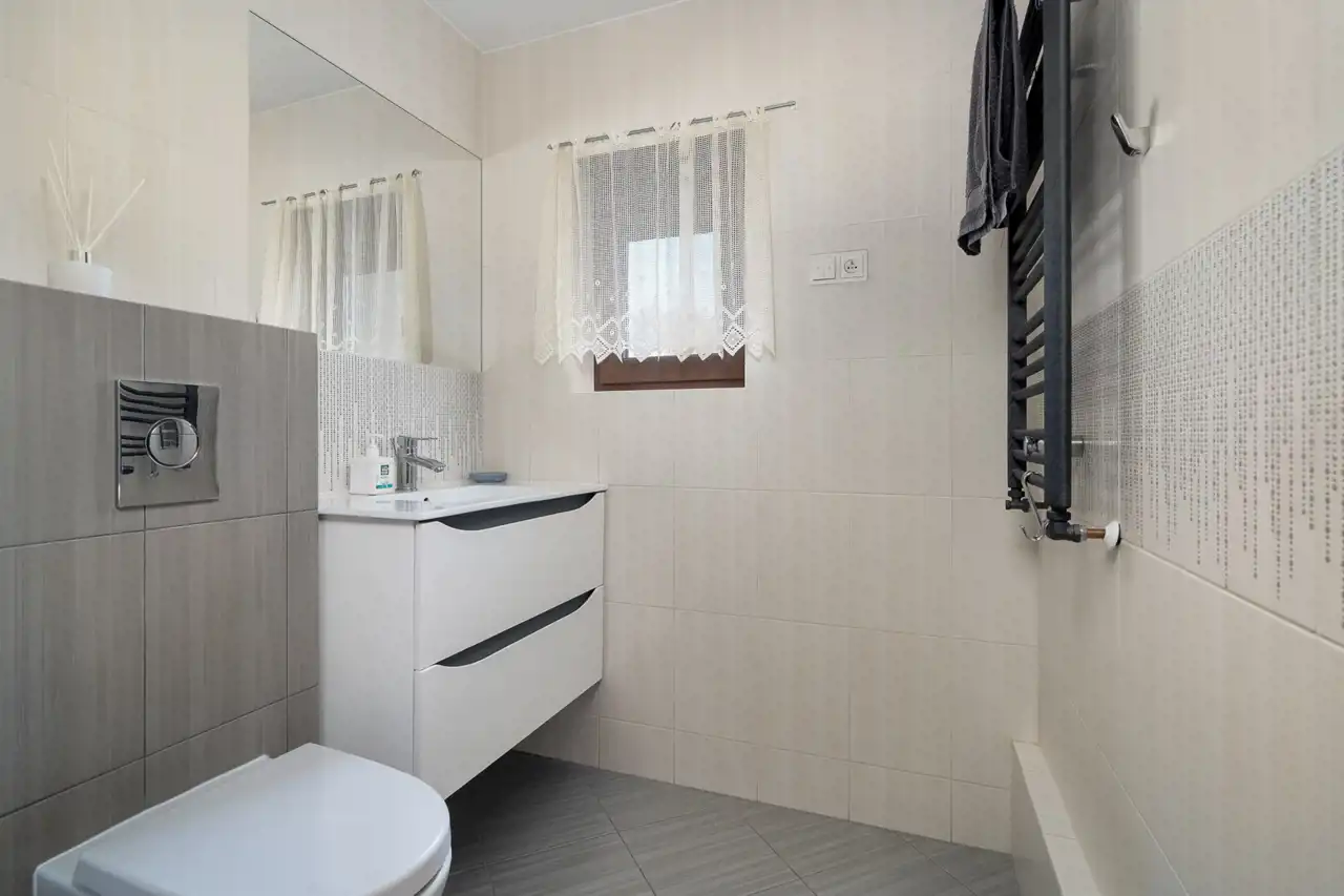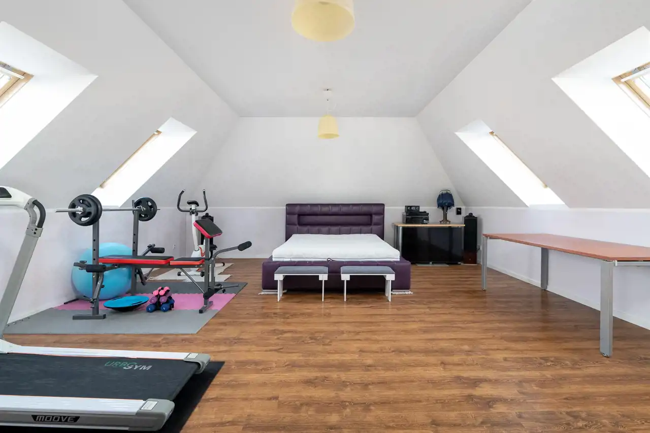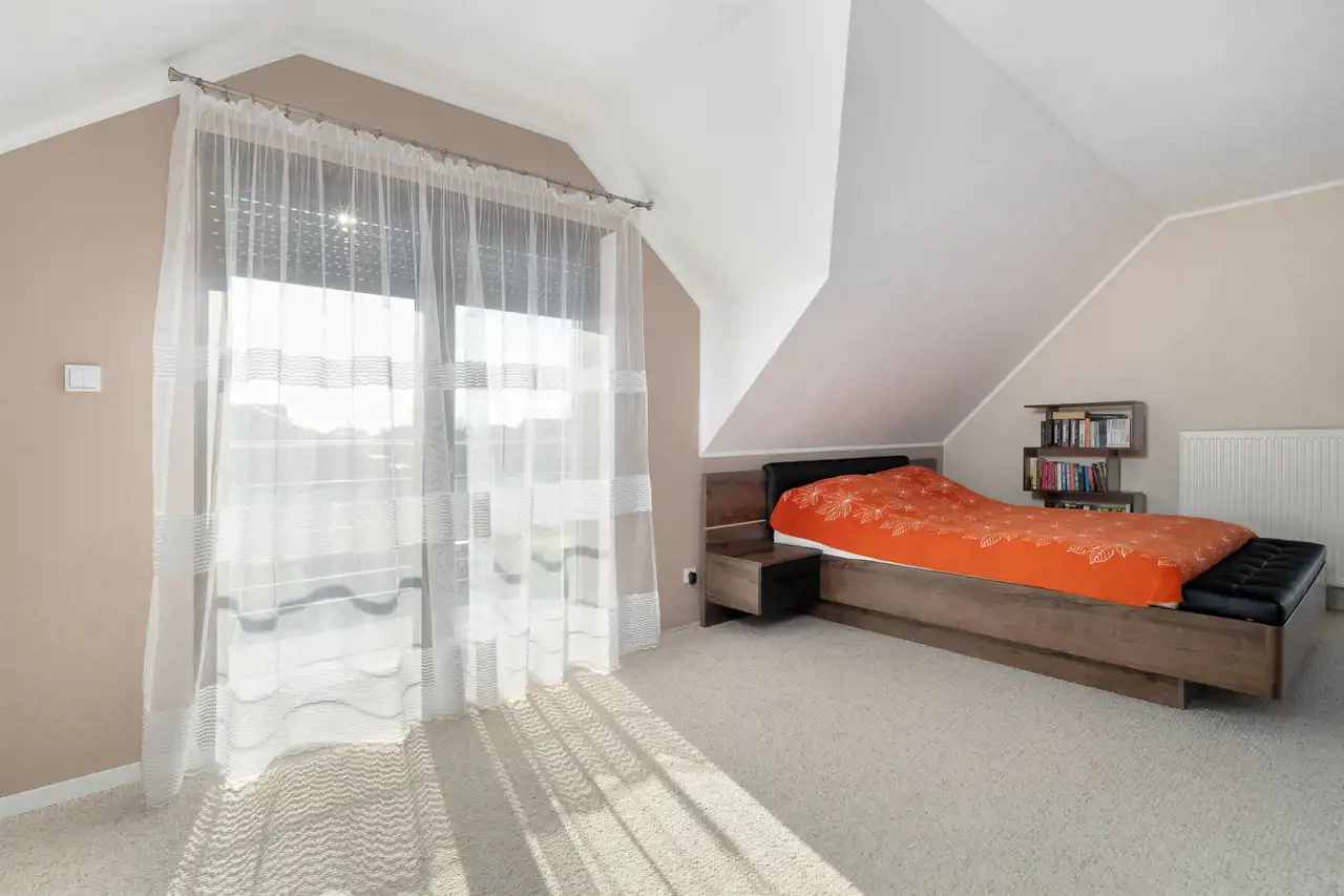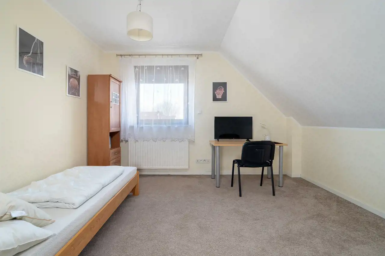 Na półpiętrze sporej wielkości sypialnia z dużą ilością okien połaciowych. Na piętrze 3 sypialnie, łazienka oraz korytarz.
