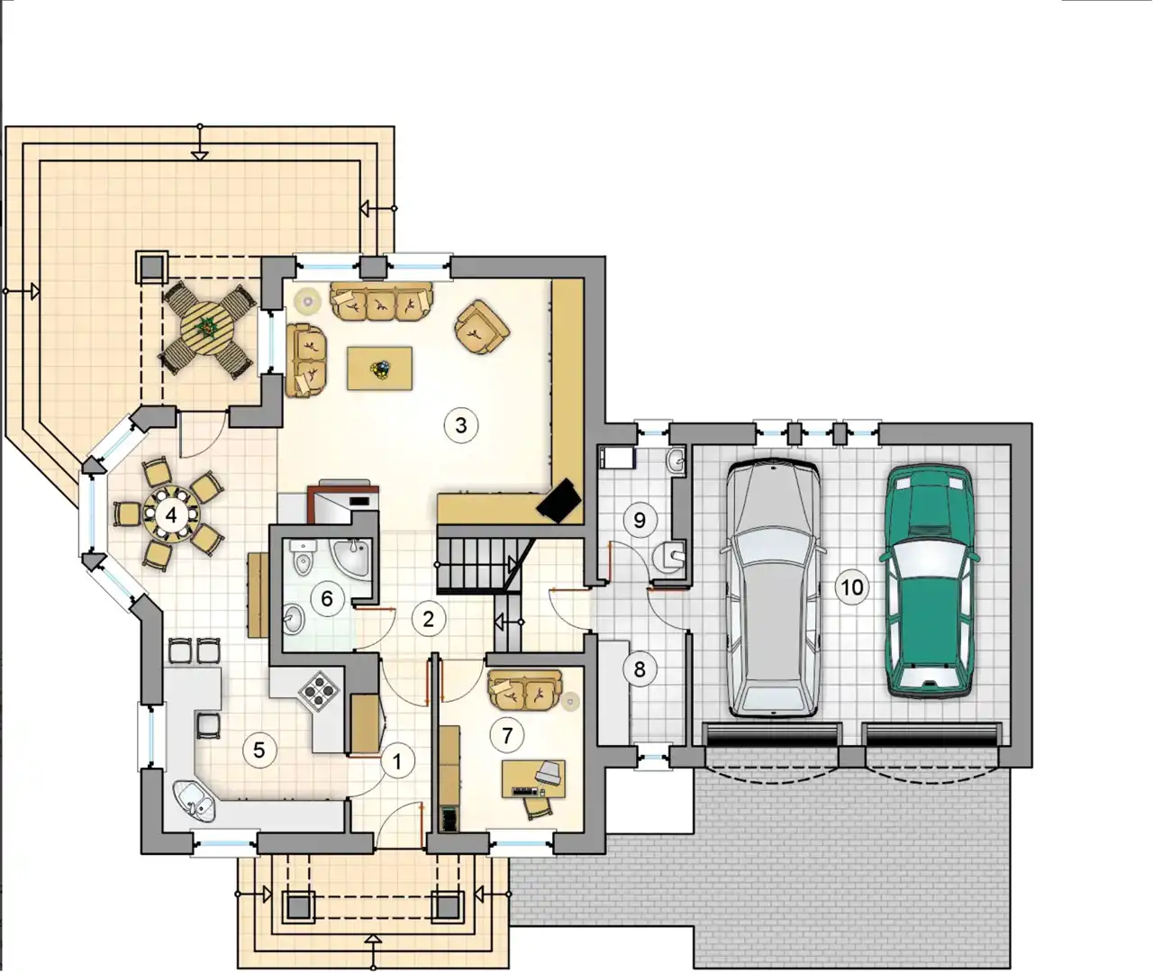 Na dolnej kondygnacji znajduje się jeszcze pokój gościnny/gabinet, łazienka, wiatrołap oraz korytarz, którym przejdziemy do dużego dwustanowiskowego garażu z brukowanym podjazdem na dodatkowe 2 auta.