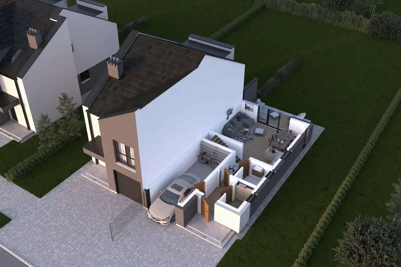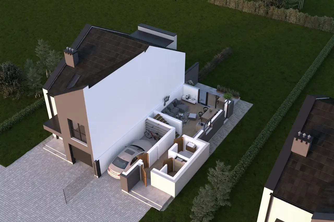 Parter: wiatrołap, hol, łazienka, pokój dzienny z aneksem kuchennym, kotłownia oraz garaż.