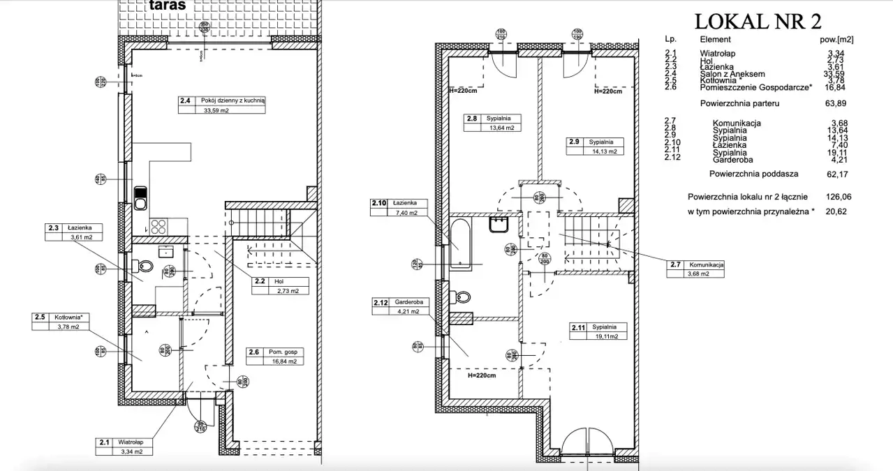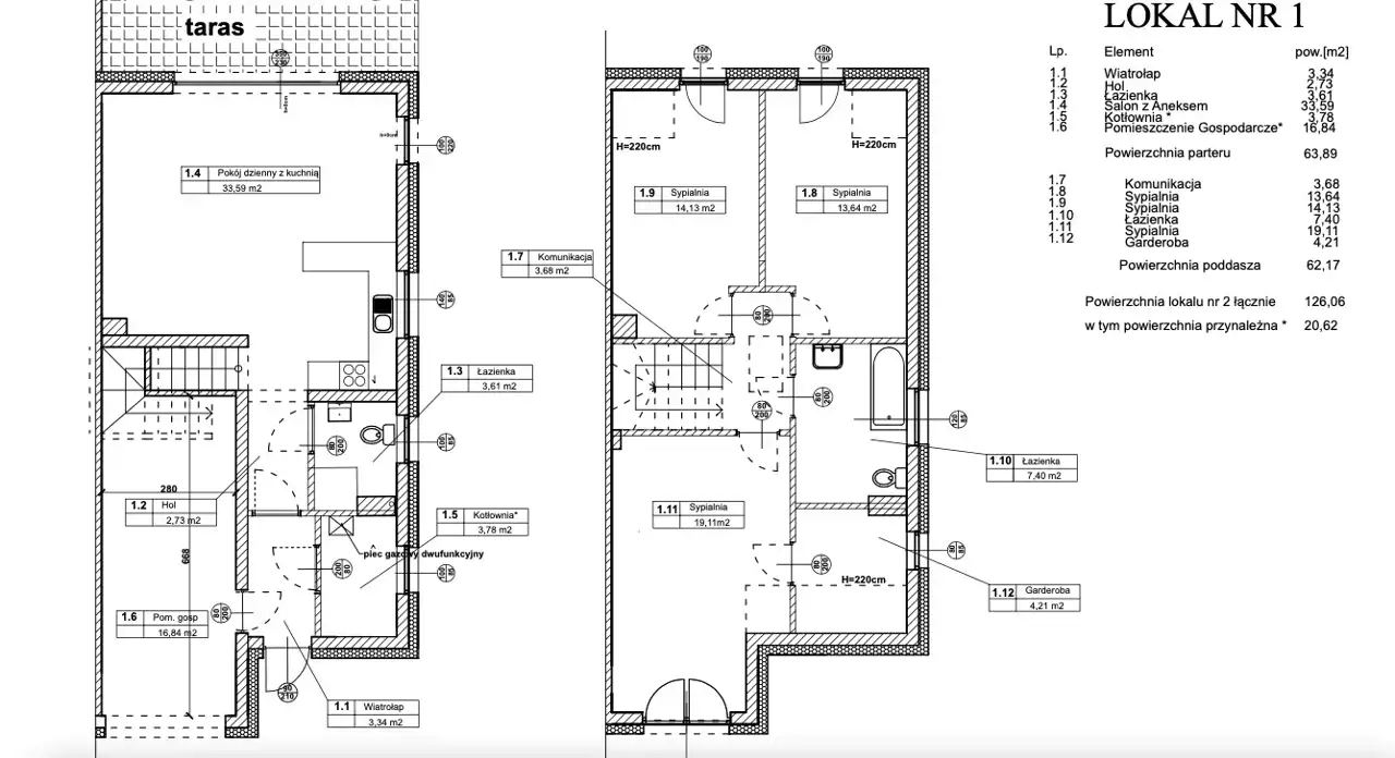 Powierzchnia każdego lokalu to 126,06 m2. Powierzchnia działki 981 m2.