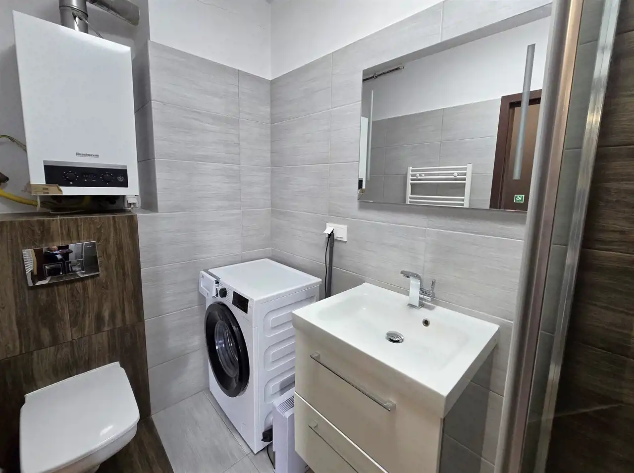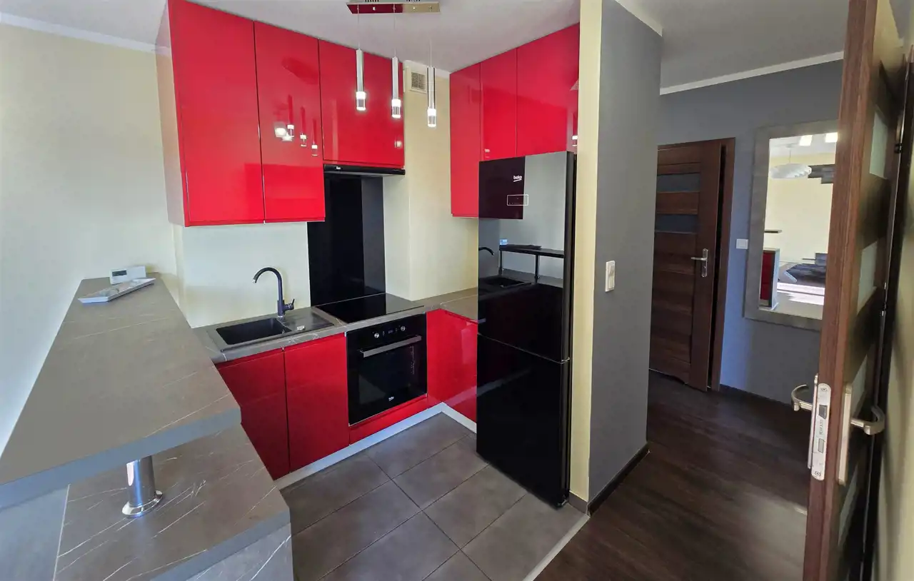 Kuchnia w zabudowie wraz ze sprzętem AGD, łazienka z garderobą, prysznicem i pralką na wyposażeniu.