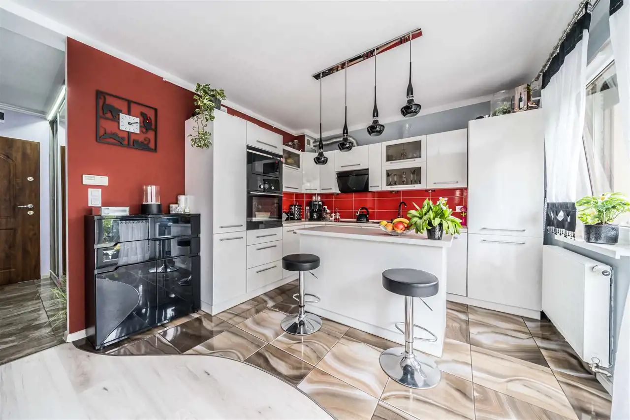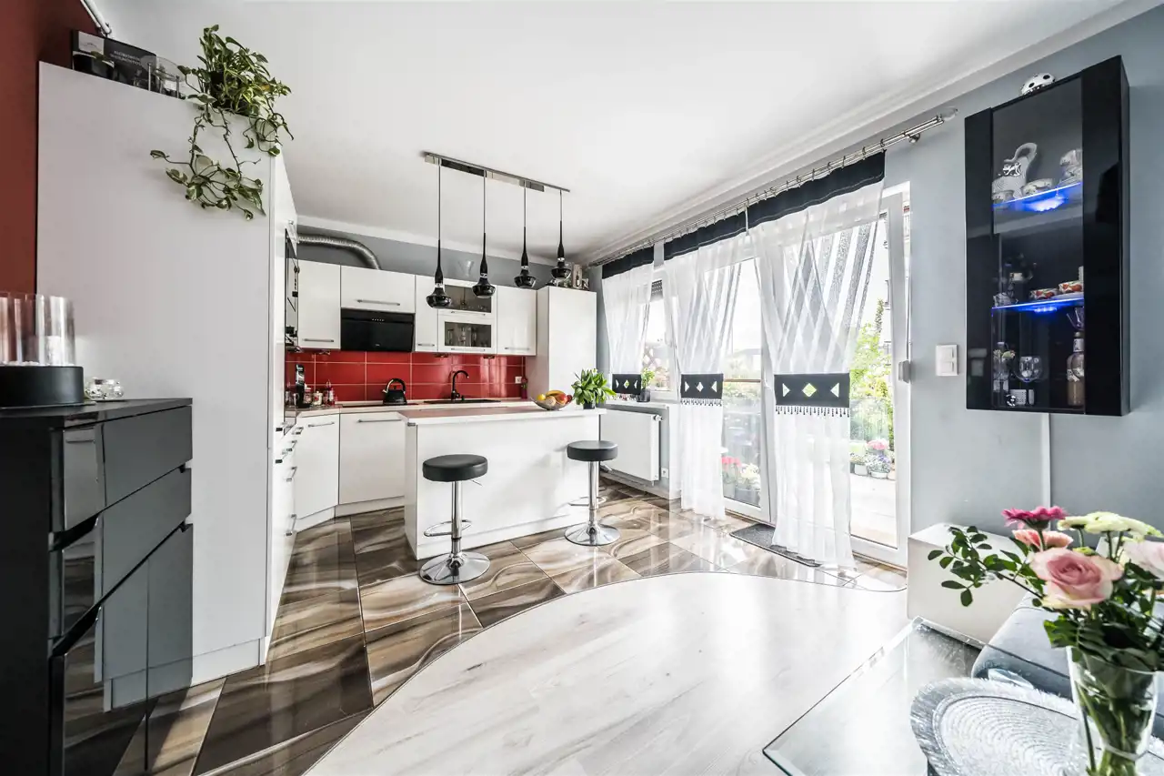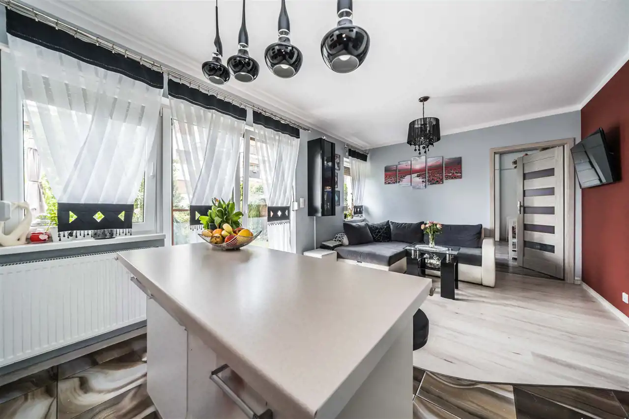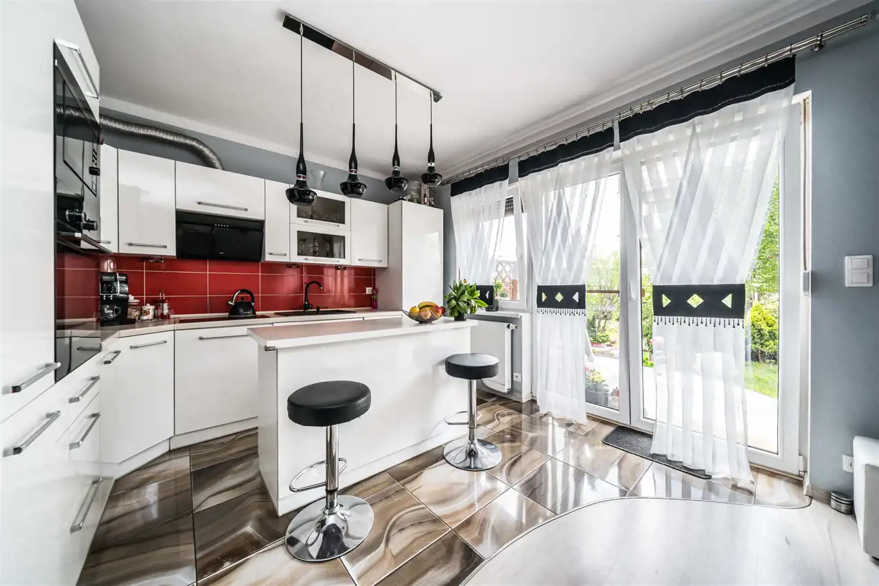 - Salon z aneksem kuchennym: o pow. 20,10 m2 z bezpośrednim wyjściem na taras i ogródek. Meble kuchenne w zabudowie na wymiar ze sprzętami AGD ( m.in. lodówka, płyta indukcyjna, zmywarka, piekarnik, pochłaniacz oraz mikrofala ). Duża ilość szafek oraz szuflad na przybory kuchenne oraz blat roboczy ( mini wyspa ) z hokerami. Na podłodze płytki ceramiczne oraz panele. Duża kanapa oraz podwieszany TV. W oknie tarasowym moskitiera przesuwna na wymiar.