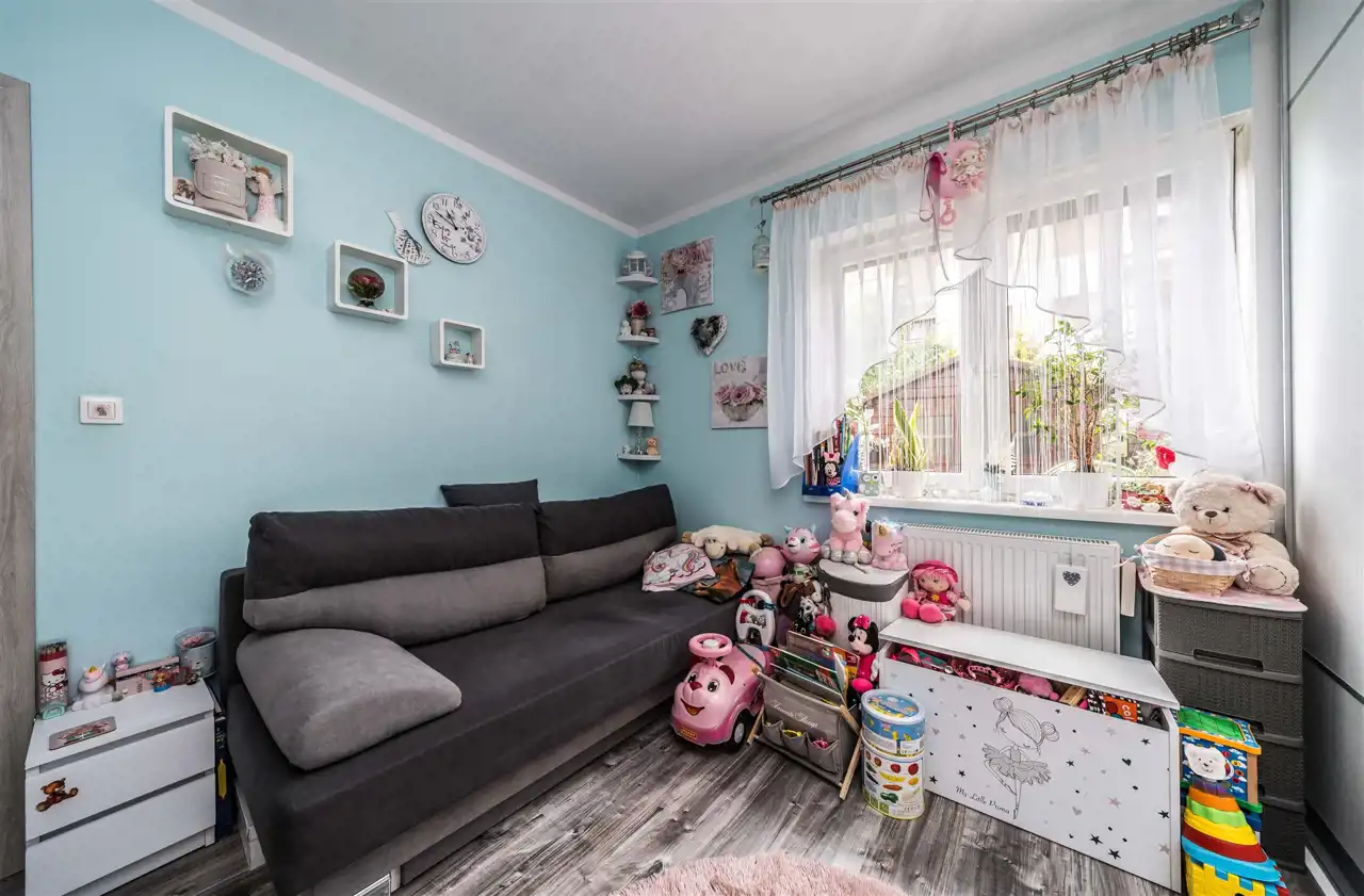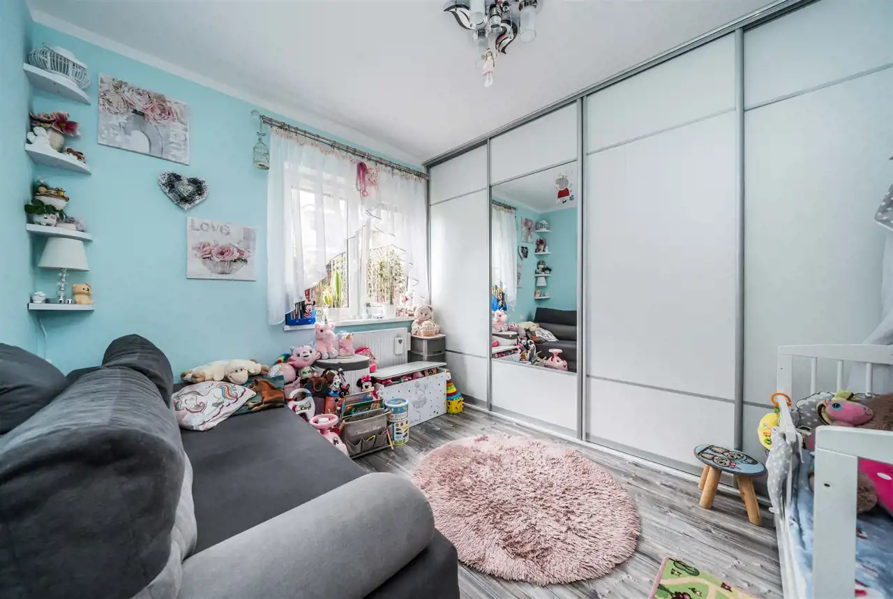 - Sypialnia: o pow. 11,29 m2 z dużym oknem od strony ogródka, duża szafa 4 skrzydłowa w systemie przesuwnym Komandor z lustrem, dobrze doświetlona i ustawna. Na podłodze panele.