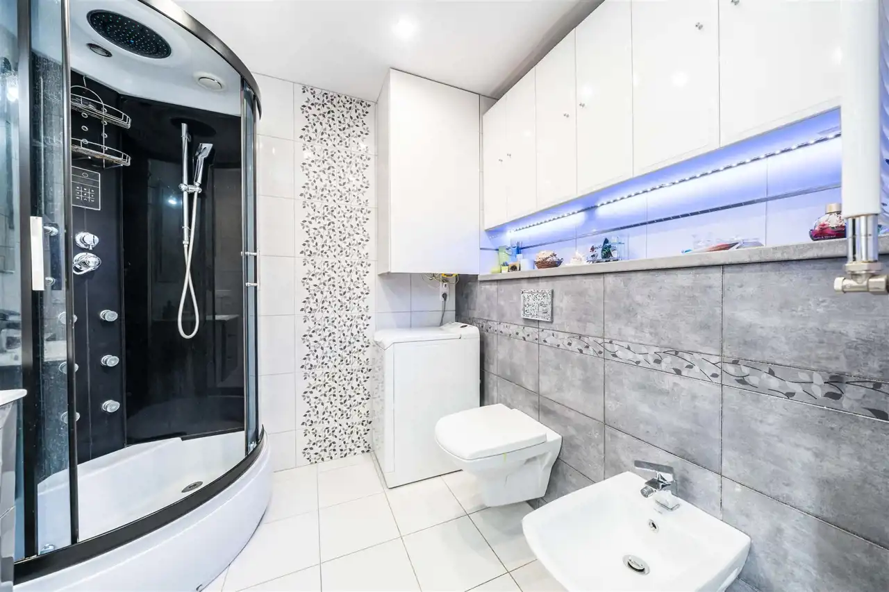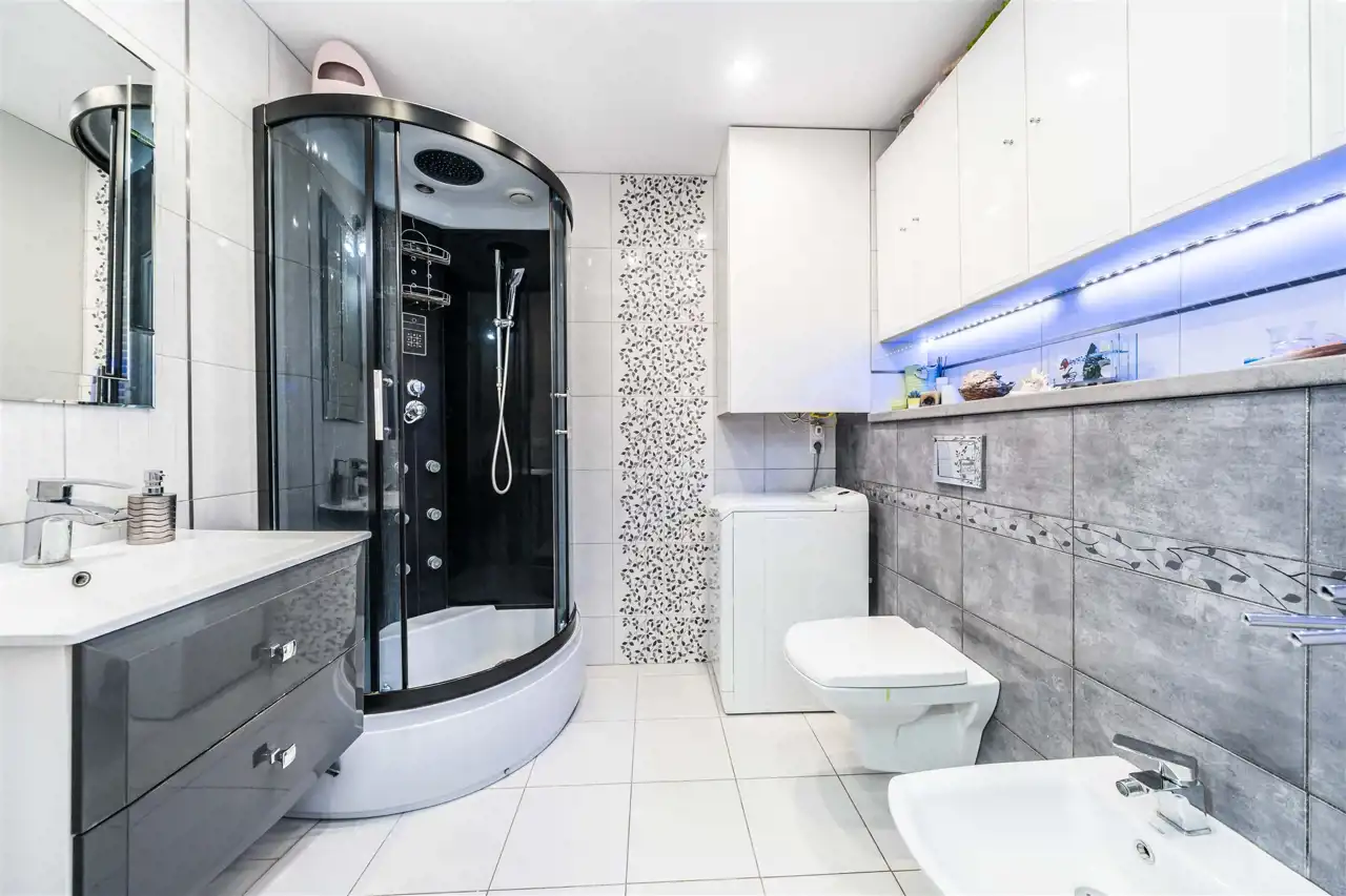- Łazienka: o pow. 4,83 m2, w pełni wykończona glazurą. Duża kabina prysznicowa z funkcją hydromasażu oraz oświetleniem. Szafka wisząca z umywalką, grzejnik drabinkowy, wc geberit w zabudowie, bidet, pralka oraz szafki wiszące na kosmetyki na wymiar z oświetleniem LED. Zabudowany kocioł gazowy 2 funkcyjny.