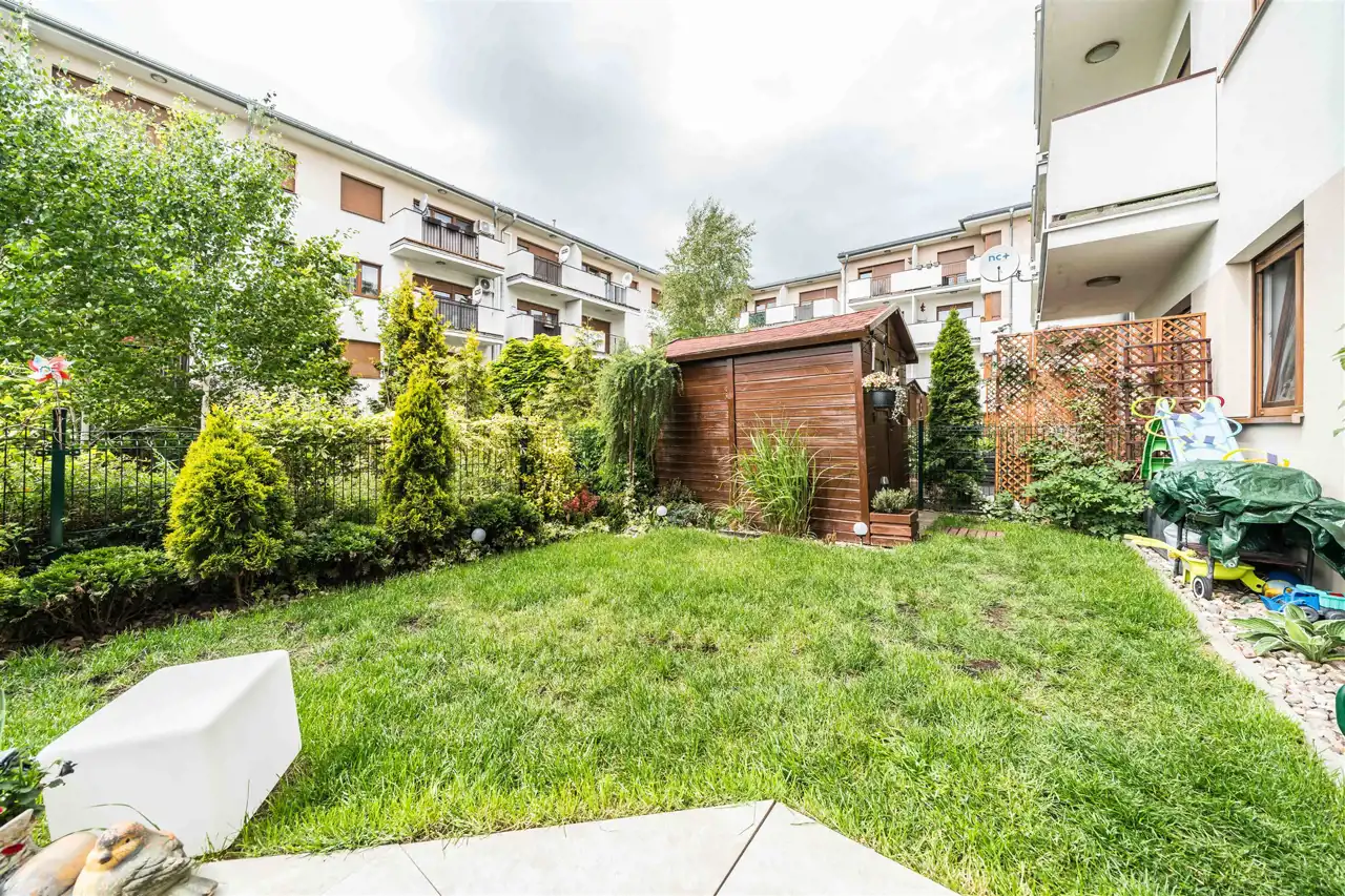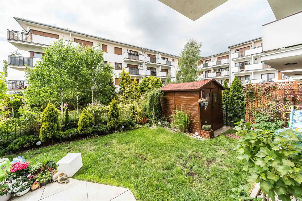 - Ogródek: o pow. 43m2, wyłożony płytami z piaskowca, w pełni urządzony z trawnikiem, licznymi nasadzeniami oraz domkiem na narzędzia. Bardzo dobrze doświetlony, idealne miejsce do spędzania wolnego czasu lub miejsce zabawy dla dzieci.