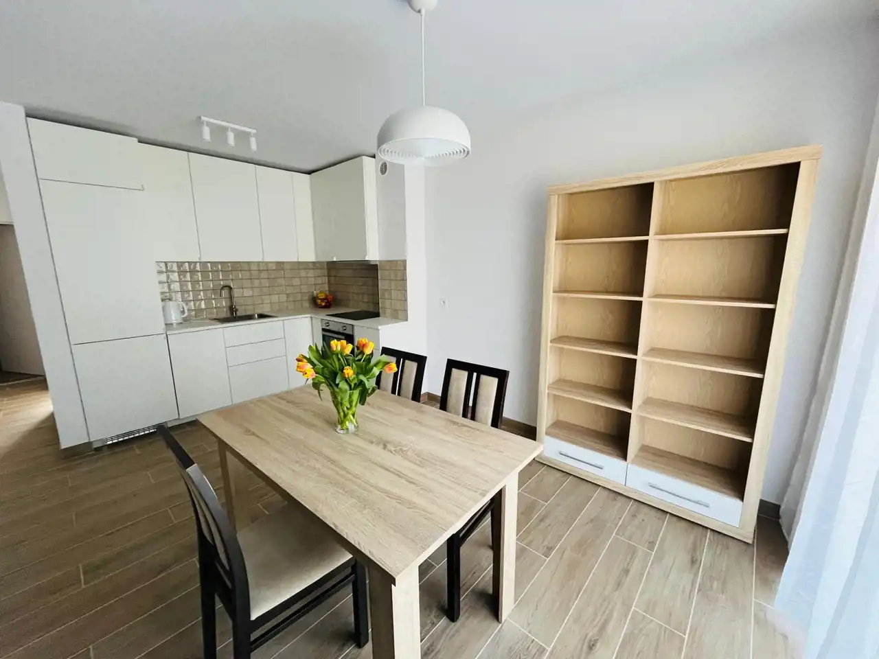 - Salon z aneksem kuchennym, nowe meble w zabudowie na wymiar, kanapa, stół + krzesła.