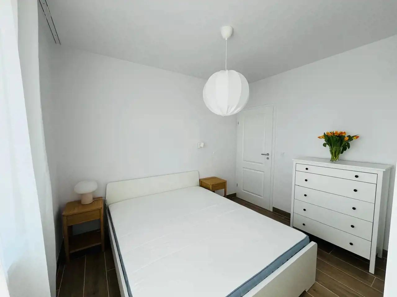 - Duża sypialnia z oknem, łóżko z materacem, szafka, oświetlenie.