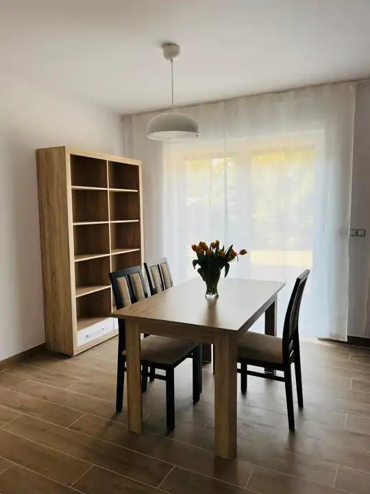 NEXT Nieruchomości poleca na wynajem nowe mieszkanie 2 pokojowe, położone na parterze z dużym ogródkiem i tarasem, kompletnie umeblowane w Rokietnicy przy ulicy Spokojnej o metrażu 45m2.