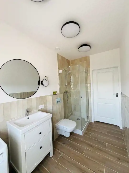 - Łazienka z prysznicem, toaleta, umywalka, pralka.