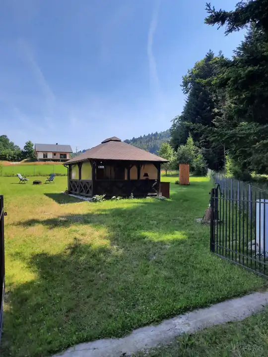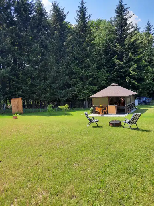 na działce znajduje się letnia altana mieszkalna, doskonała jako baza rekreacyjna na czas budowy lub miejsce do wypoczynku,