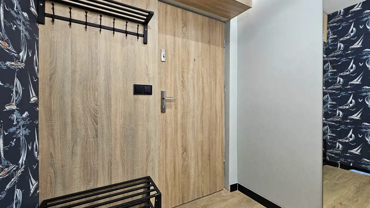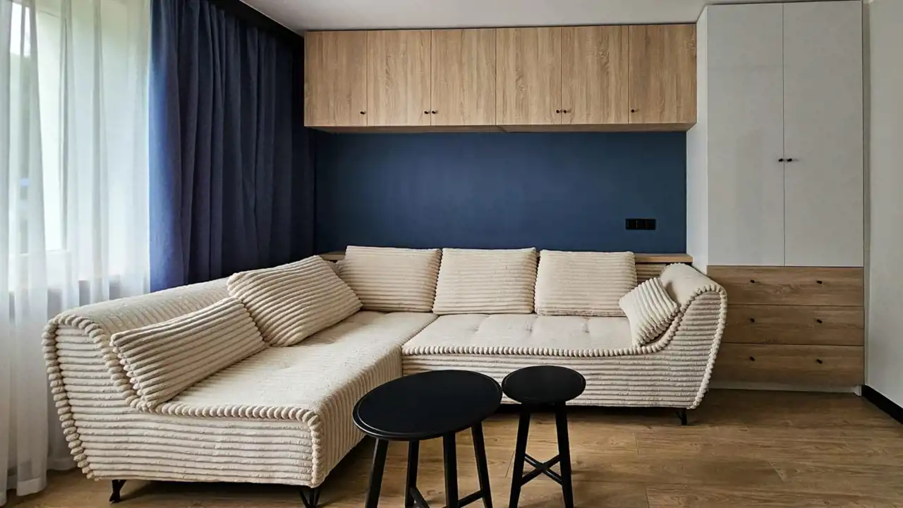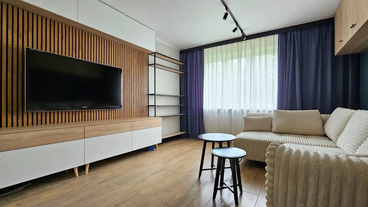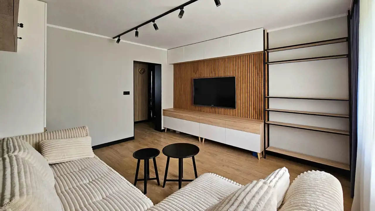 W salonie pełniącym funkcję sypialni znajduje się rozkładana kanapa z funkcją spania, nowoczesna zabudowa z lamelami oraz meblami ze stalowymi elementami. Mieszkanie sprzedawane jest z pełnym umeblowaniem, w tym z tekstyliami, zasłonami, firanami i nowym kompletem pościeli.