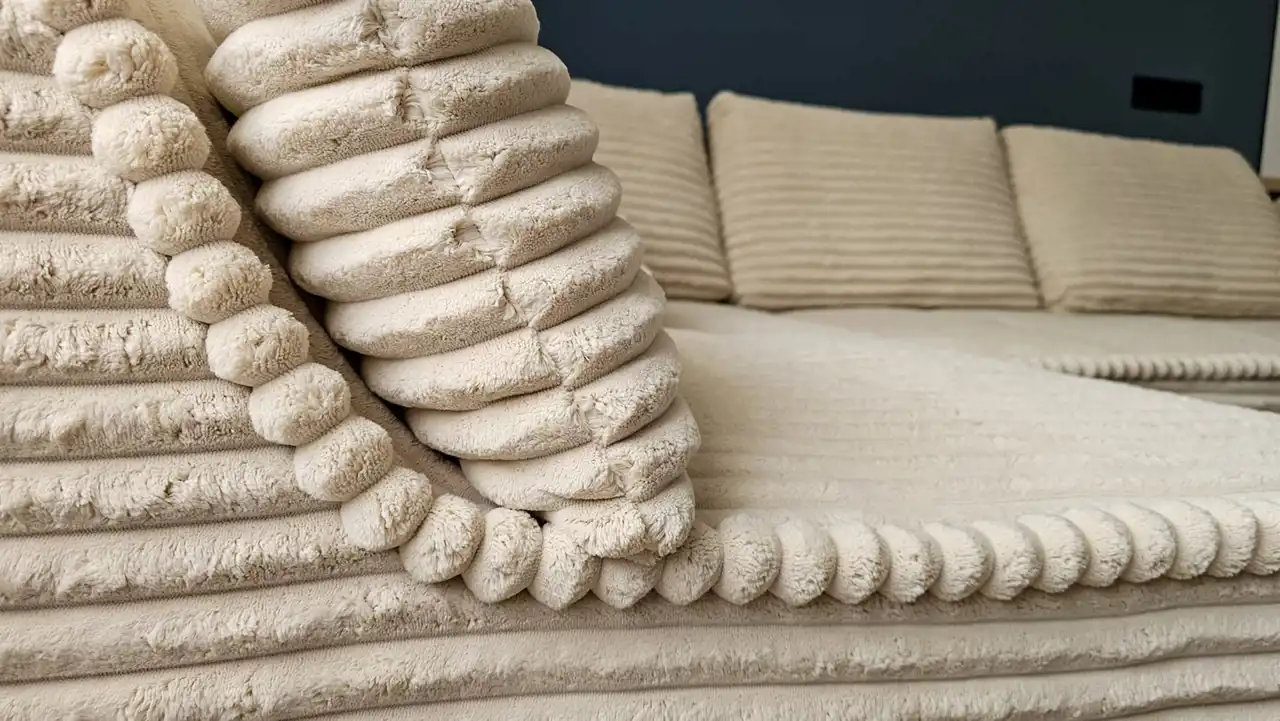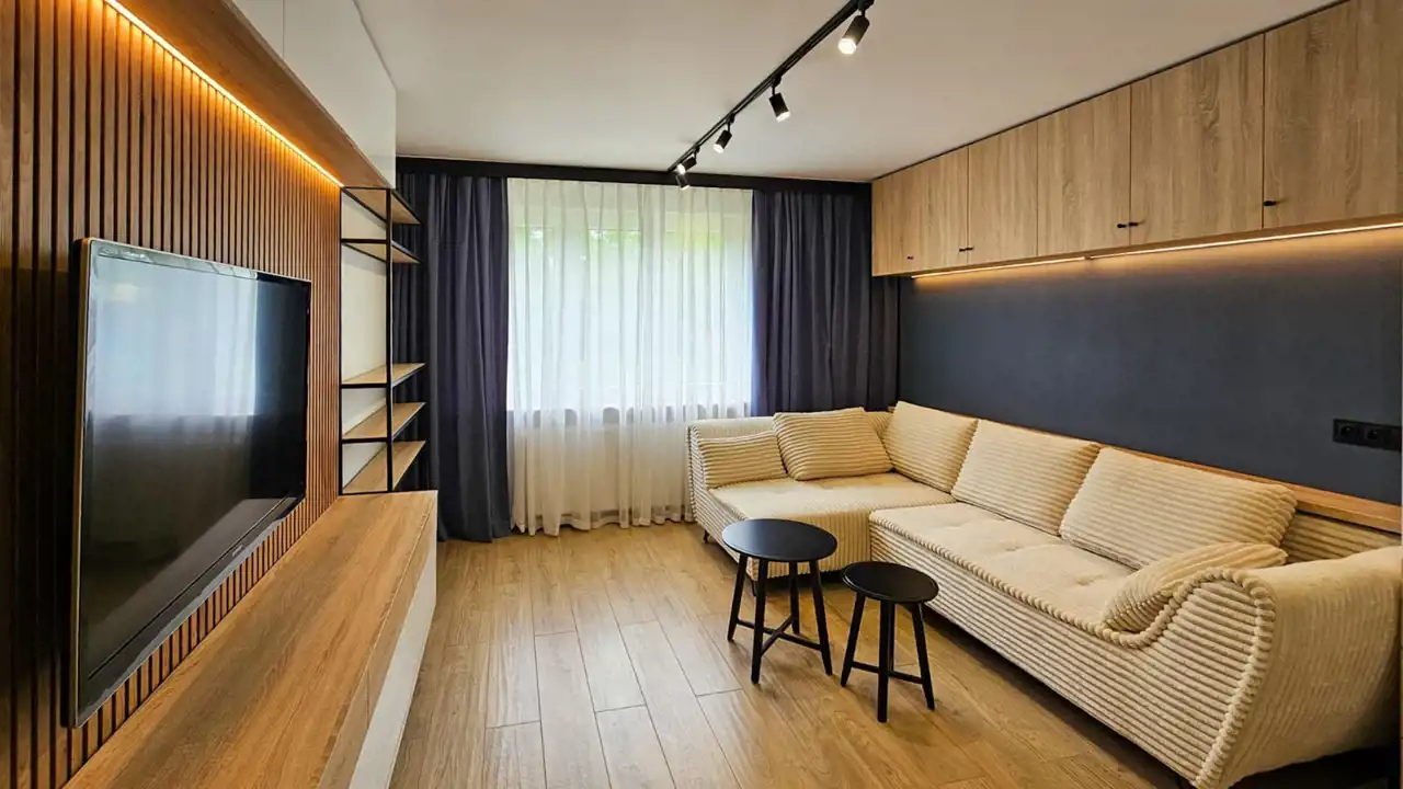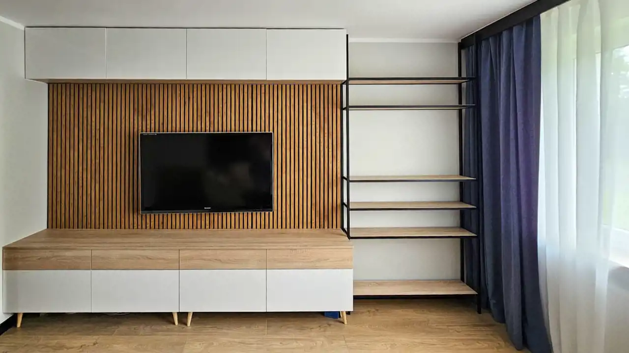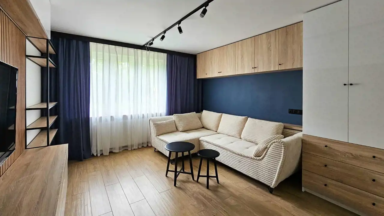 W salonie pełniącym funkcję sypialni znajduje się rozkładana kanapa z funkcją spania, nowoczesna zabudowa z lamelami oraz meblami ze stalowymi elementami. Mieszkanie sprzedawane jest z pełnym umeblowaniem, w tym z tekstyliami, zasłonami, firanami i nowym kompletem pościeli.