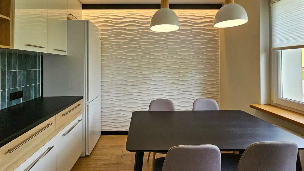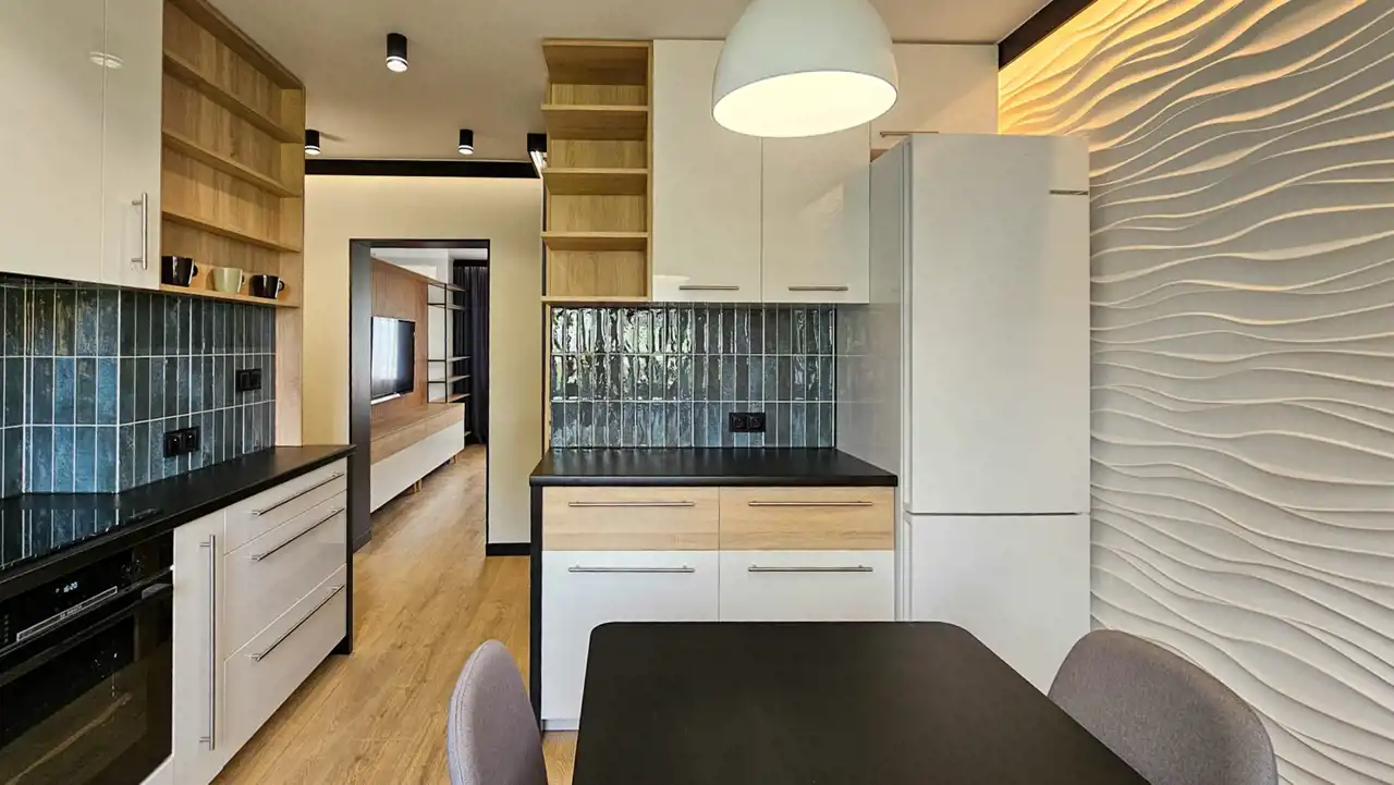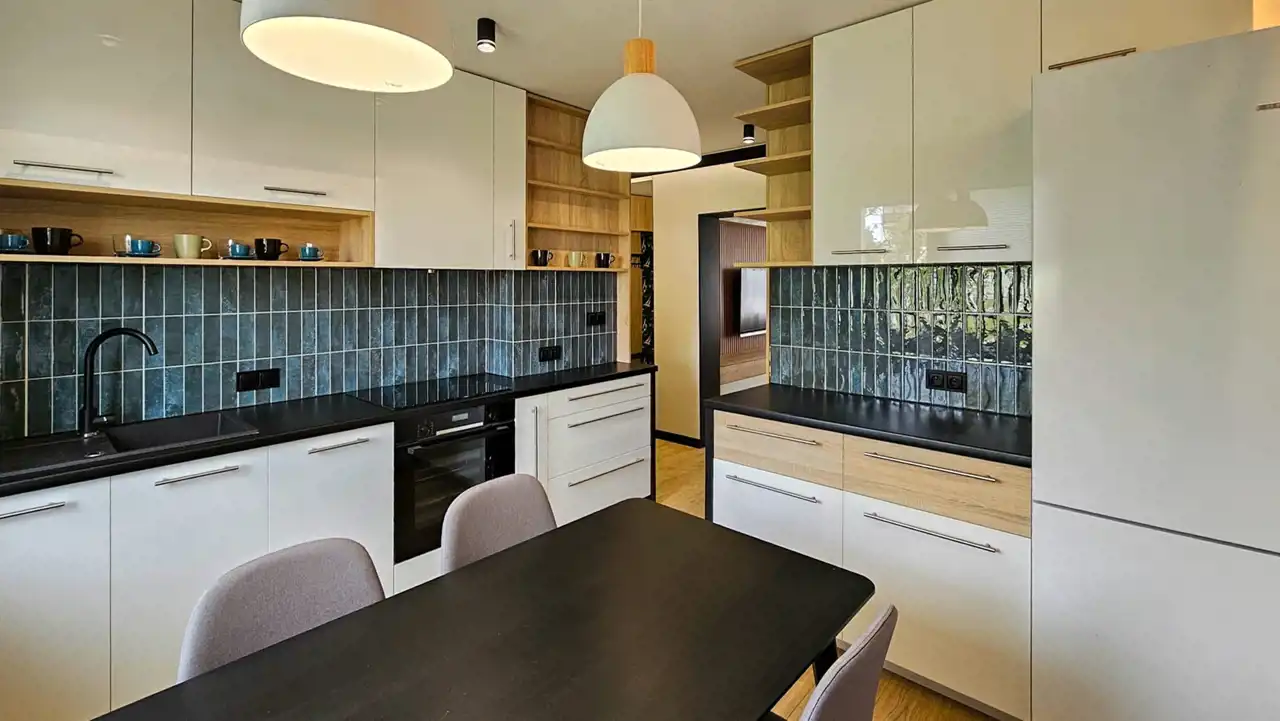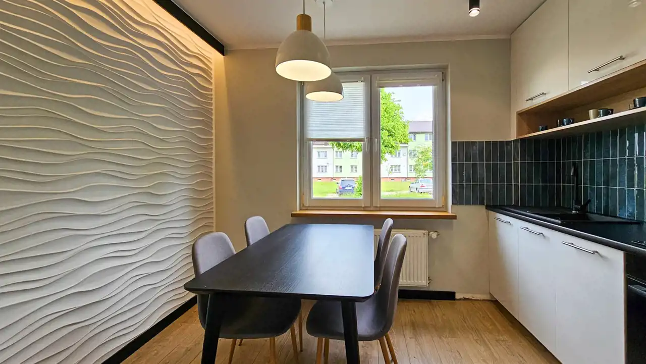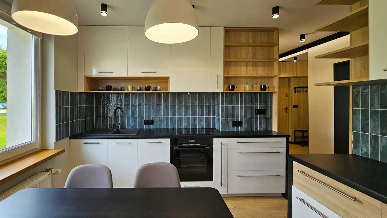 Wnętrze zaprojektowane zostało w nowoczesnym stylu z delikatnymi akcentami żeglarskimi, które podkreślają lokalny klimat i nawiązują do mazurskiego charakteru regionu. Jasna kuchnia z funkcją jadalni wyposażona jest w nowe meble wykonane na wymiar, a także wysokiej klasy sprzęt AGD: lodówkę, piekarnik, płytę grzewczą, okap oraz ekspres do kawy. Znajdziemy tu także stół z krzesłami i niezbędne akcesoria kuchenne.