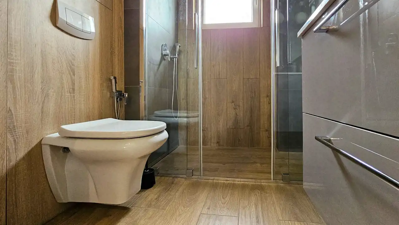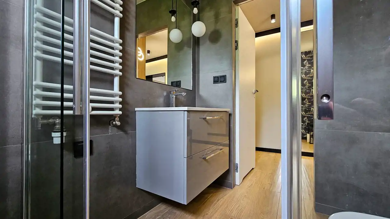 Funkcjonalna łazienka została wykończona z dużym wyczuciem stylu. Znajduje się tu prysznic typu walk-in, toaleta z bidettą, umywalka z szafką oraz zabudowa ścienna wykonana na wymiar. W łazience zamontowano termę o pojemności 80 litrów.