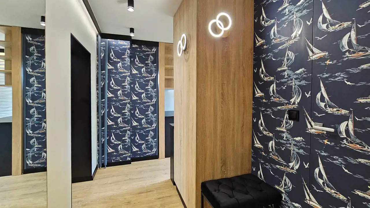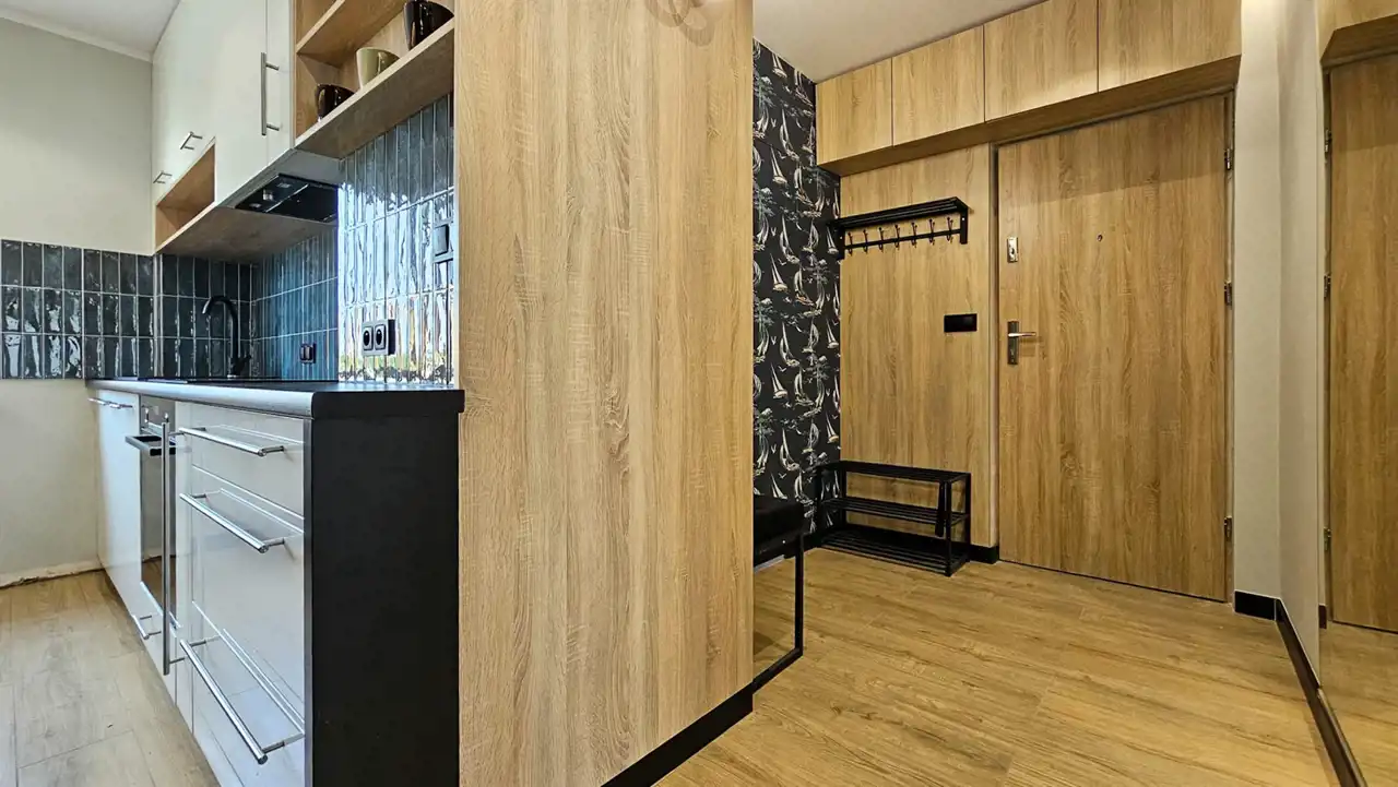 Z korytarza wydzielono dodatkowe małe pomieszczenie z przesuwanymi drzwiami, które pełni funkcję składziku, ale może również zostać wykorzystane jako przestrzeń dla rozkładanego łóżka.