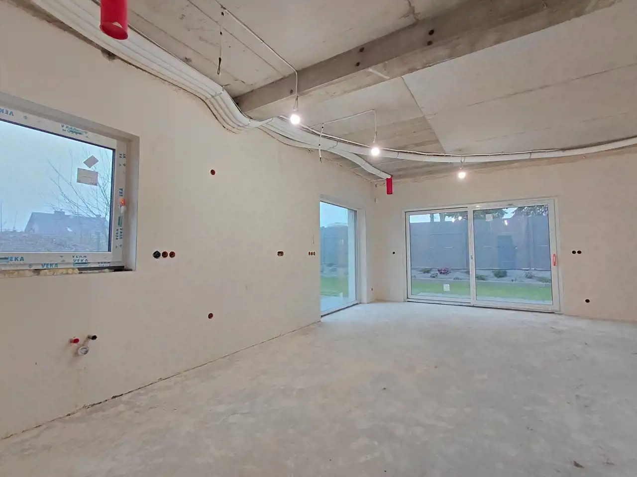 Dom wyposażony jest w nowoczesne rozwiązania techniczne. Posiada trzyszybowe okna Veka w kolorze antracytowym, duże przesuwne przeszklenia w systemie HS, rolety zewnętrzne sterowane elektrycznie, ogrzewanie podłogowe na obu kondygnacjach oraz przygotowaną instalację pod pompę ciepła. W standardzie znajduje się także rekuperacja, klimatyzacja we wszystkich pokojach, system alarmowy, monitoring oraz szybki światłowód. Ogród został wykończony i ogrodzony, co pozwala od razu korzystać z przestrzeni zewnętrznej.