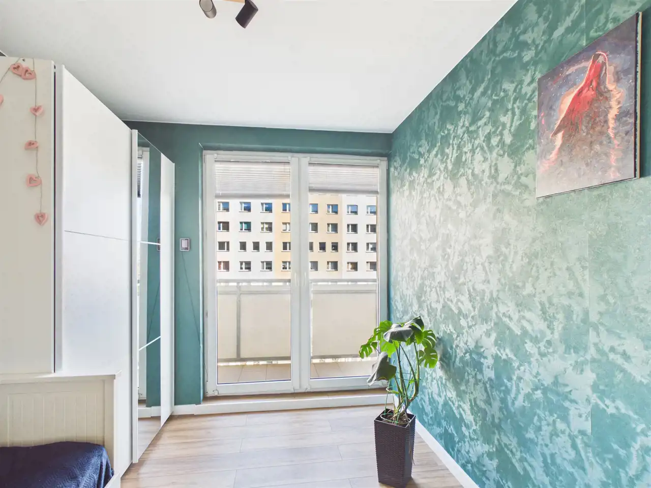 Okna oraz balkon skierowane są na południe, dzięki czemu mieszkanie jest słoneczne i jasne przez większą część dnia.