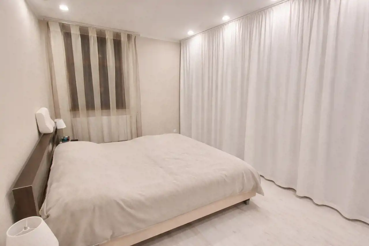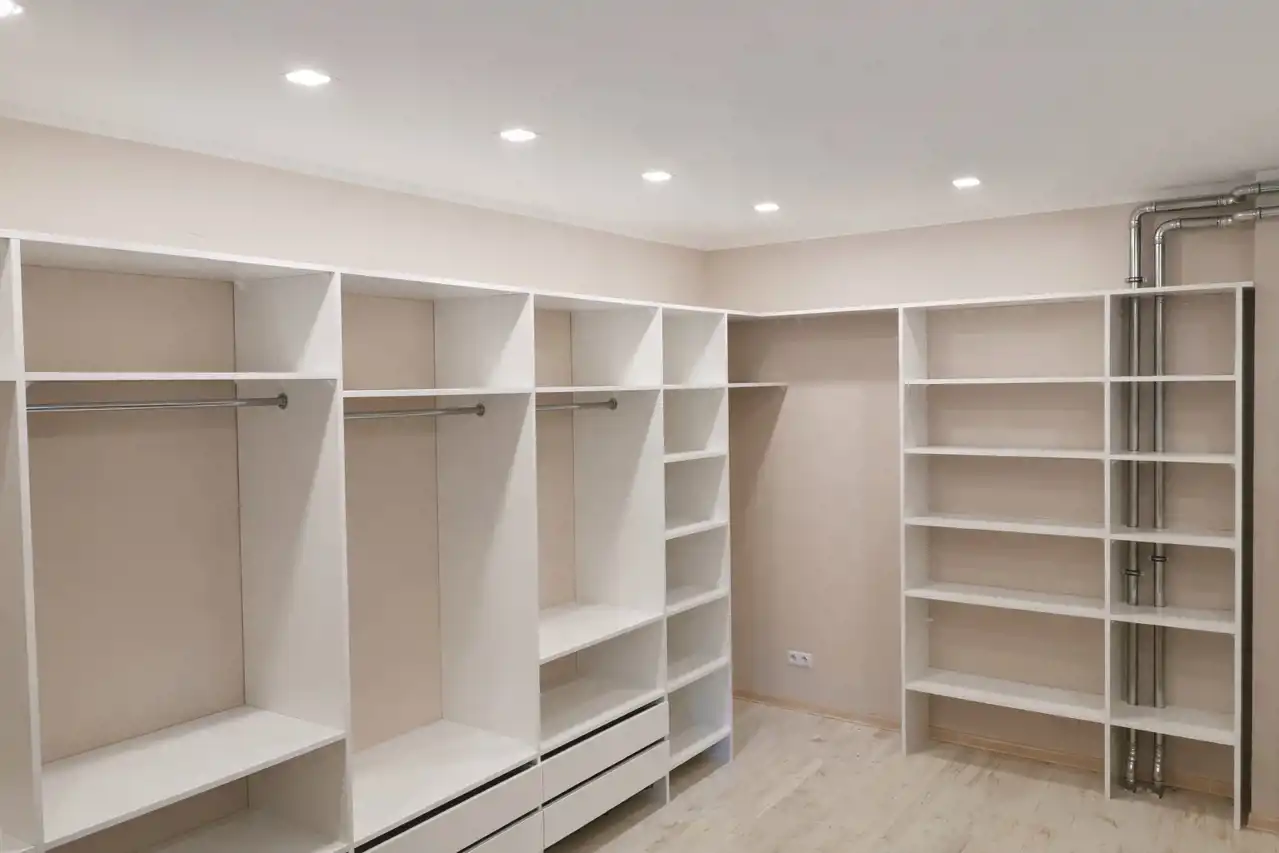 Pokój 1 (17 m²) – przestronna sypialnia z dużą, zabudowaną szafą na dwóch ścianach, półkami i szufladami, łóżkiem z materacem oraz szafkami nocnymi